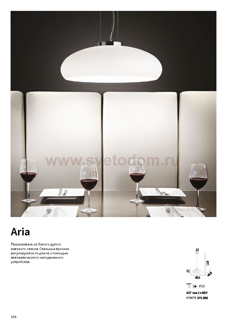 Подвесной светильник от известной итальянской фабрики Ideal lux из каталога Moderno в современном стиле под артикулом ARIA SP1 D50 (59679) серии ARIA имеет ряд отличительных характеристик: Рассеиватель из белого дутого матового стекла. Стальные тросики регулируются по длине с помощью автоматического неподвижного устройства.