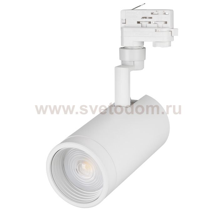 Светильник подвесной для треков/шин 4 провода для продуктов. Мощность 30 Вт, св. поток 2222 лм, 74 лм/Вт, специальный теплый 3000 K для красных и желтых фруктов и овощей, изменяемый угол 20-60°, напряжение питания 230 В. Белый корпус из алюминия, материал линзы PMMA, степень защиты IP20. Размер: диаметр 100 мм, высота 220 мм. Монтаж на трек 3-фазный. Драйвер 33-44 В, 750 мА, пульсация <1%.