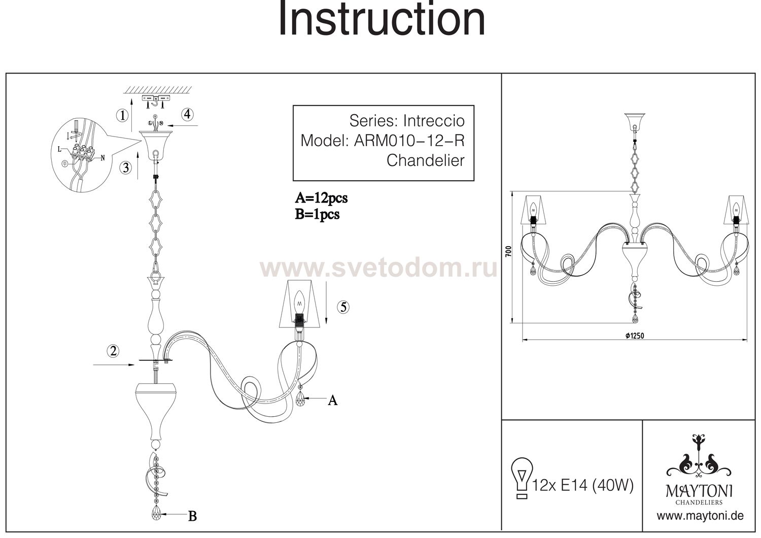 Особенности модели ARM010-12-R: Арматура из металла. Декоративные элементы в виде лент. Подвески из *хрусталя.
