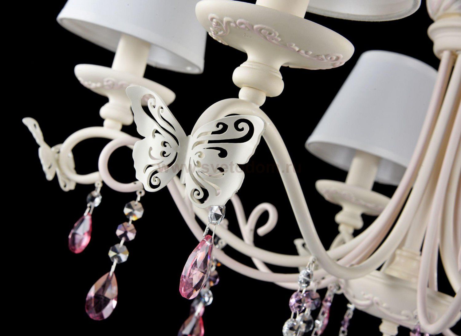 Особенности модели ARM032-05-PK: С самого первого взгляда светильники серии очаровывают своим сказочным образом, даря атмосферу нежности и волшебства. Каркасы светильников изготовлены из металла и выкрашены в белый цвет. С рожков свисают подвески из цветных кристаллов. Абажуры из хлопка на ПВХ. Образ дополняют бабочки, расположившиеся на потолочных чашах, рожках и абажурах.