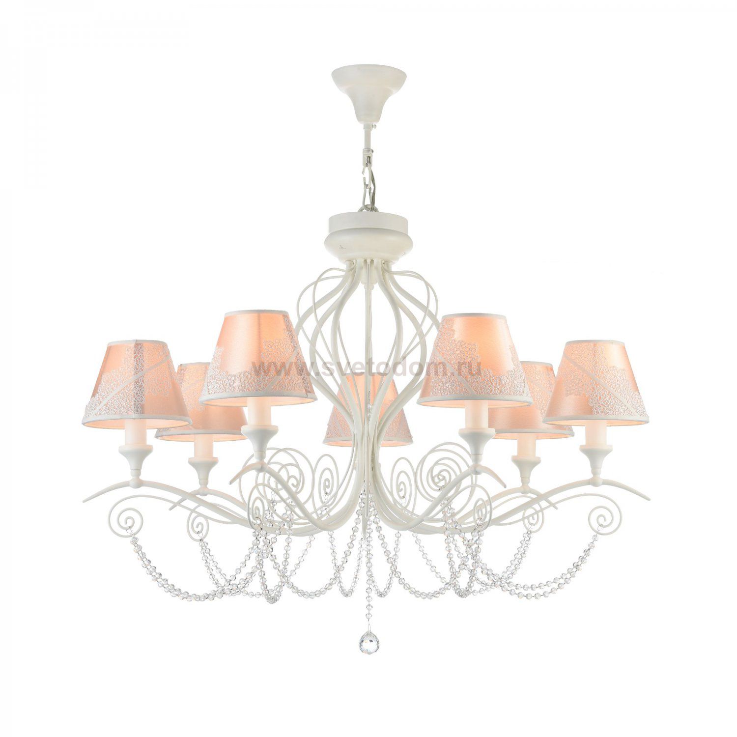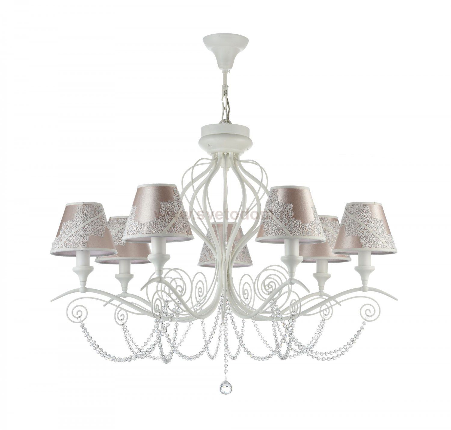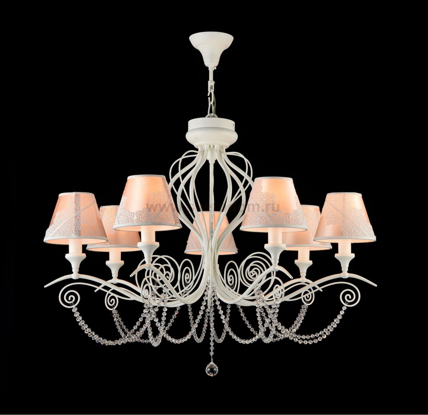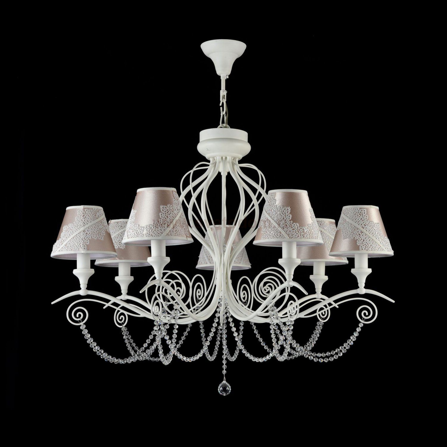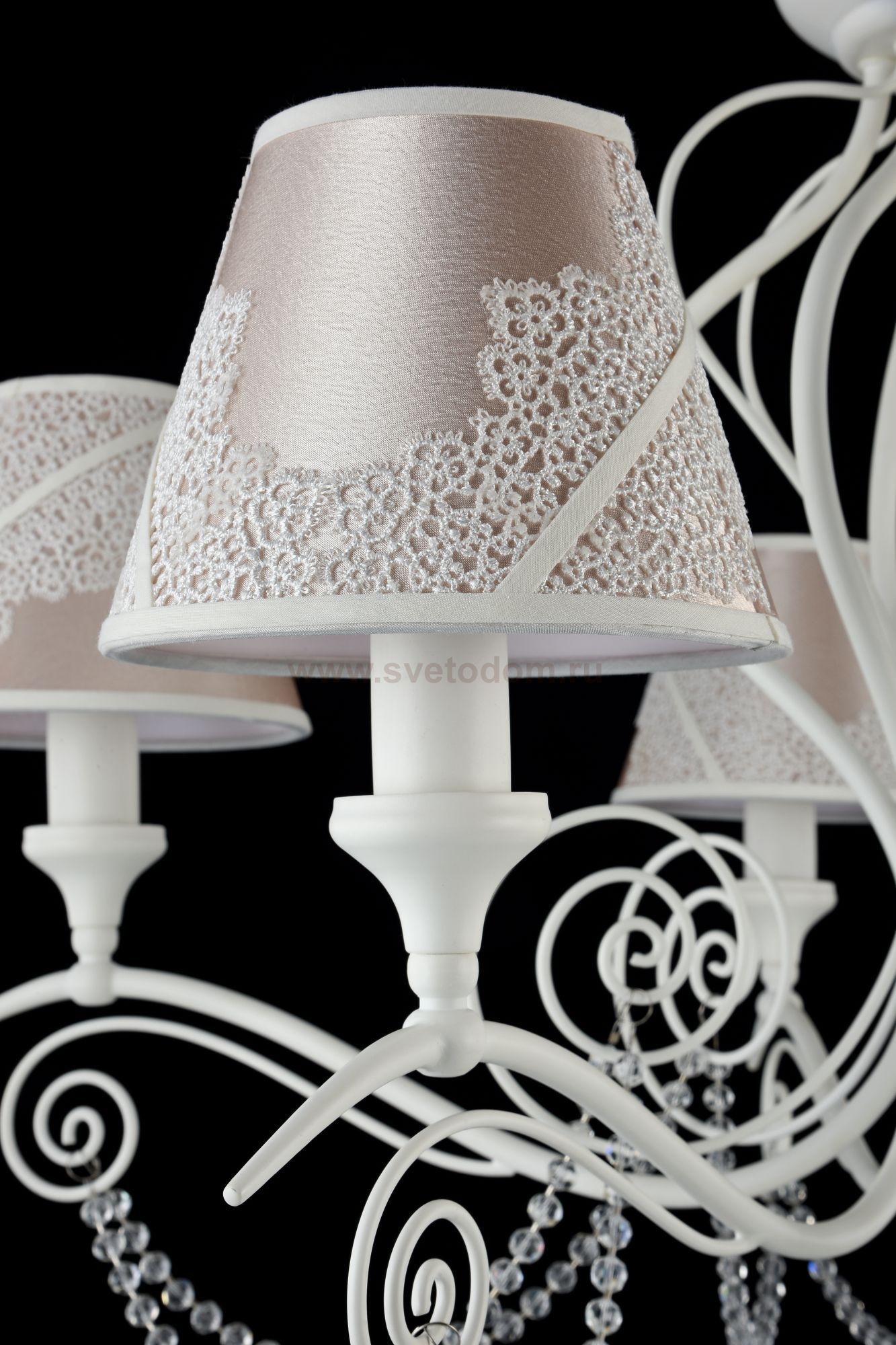 Арматура из металла. Абажур из ПВХ покрыт атласом и украшен кружевом. Подвески в виде бусин из стекла. Дополнительно