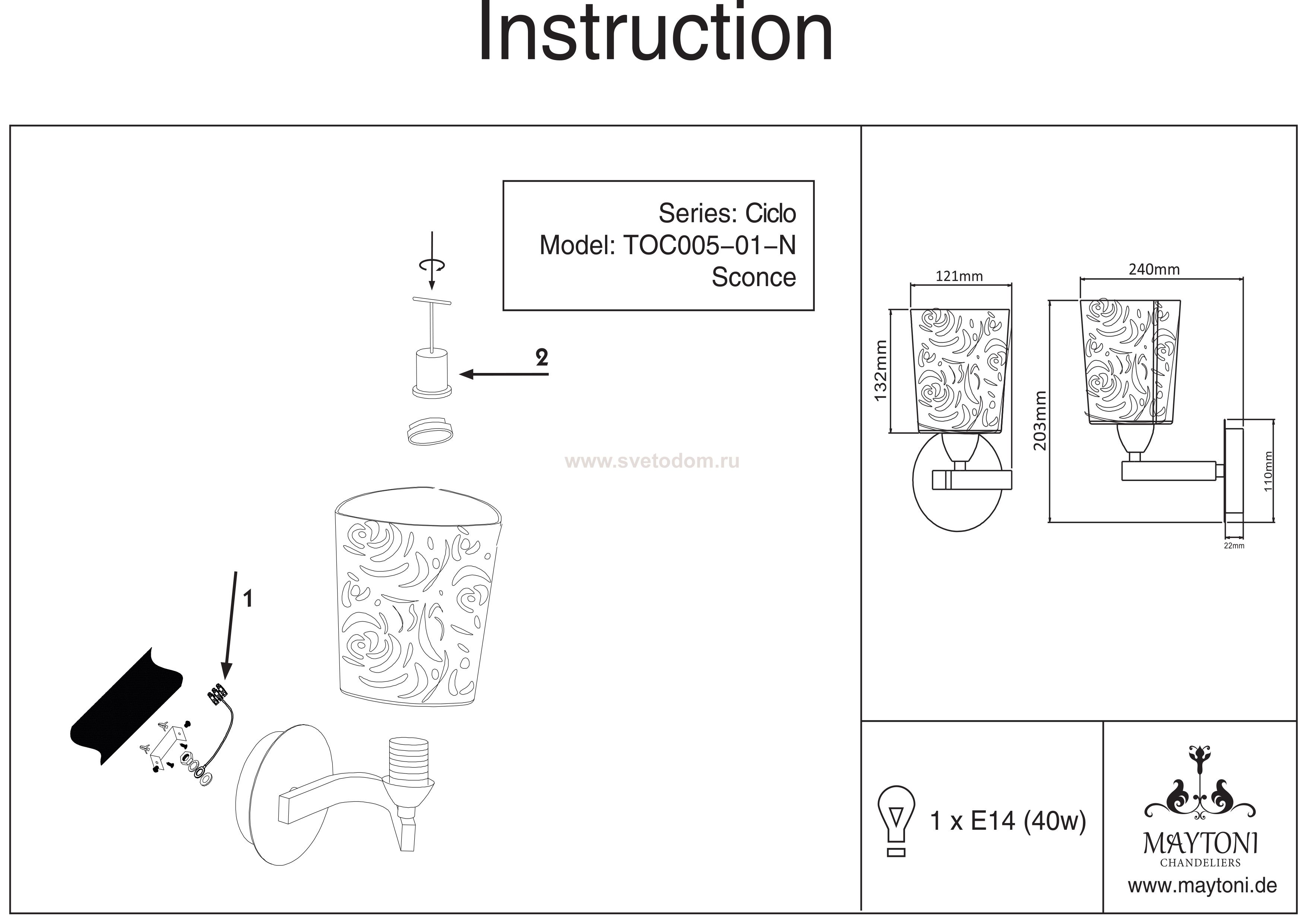 Новое бра от компании Майтони обрадует потенциальных покупателей не только своими качественными и декоративными характеристиками, но и невысокой ценой. Посмотрите на фото бра Maytoni ARM055-WL-01-N, и отметьте, насколько изящным плафоном наградили его дизайнеры Maytoni. Он имеет форму слегка сплюснутой трапеции и отличается узорными орнаментами. Такое оформление позволяет плафону идеально гармонировать со светлым, цвета венге и хром, каркасом композиции, имеющим в своем составе округлую крепежную арматуру и рожок в форме полумесяца. |