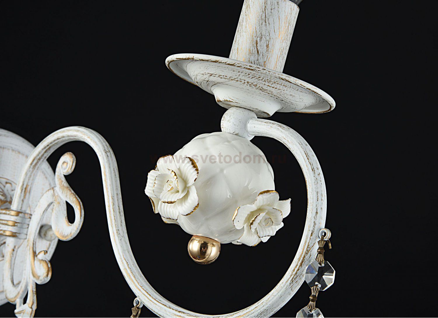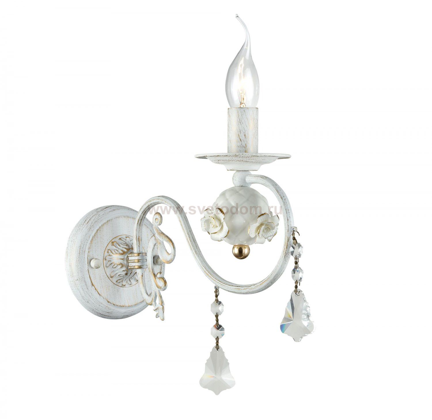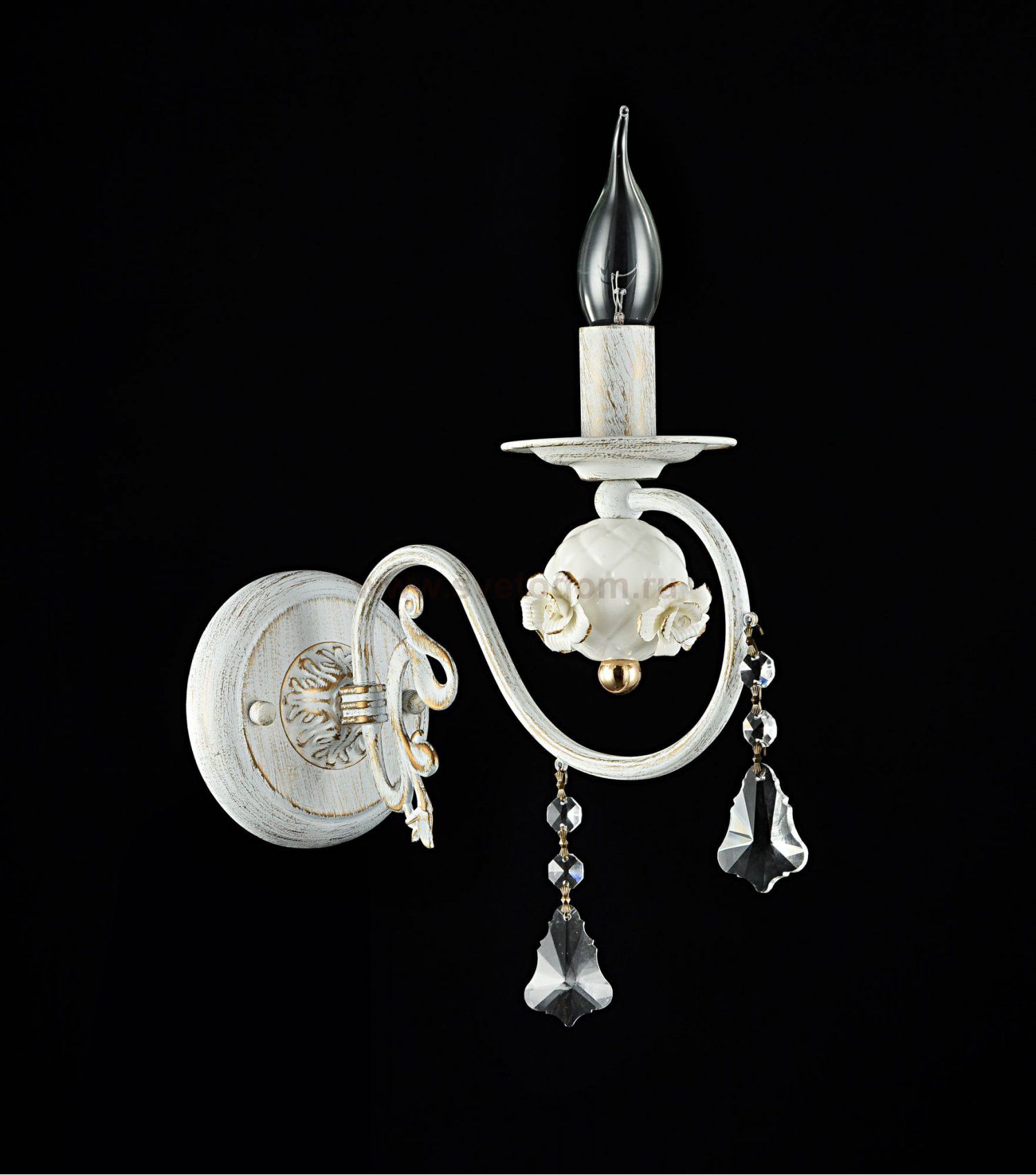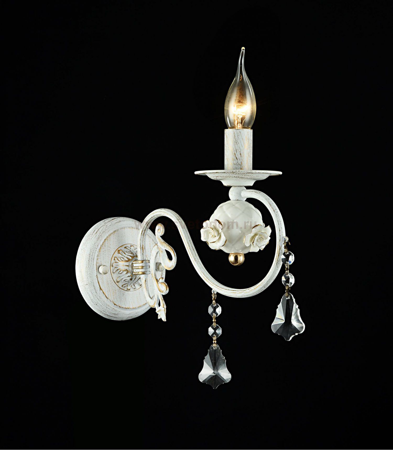 Арматура из металла белого цвета. Основание и рожки украшены вручную декоративными элементами в виде розочек и шара. Подвески необычной формы из *хрусталя. Комментарий
