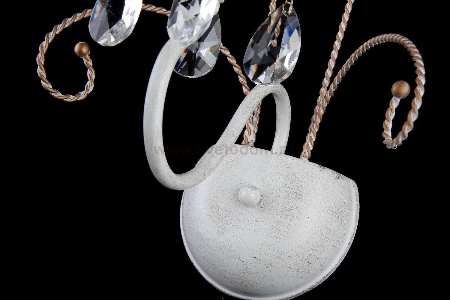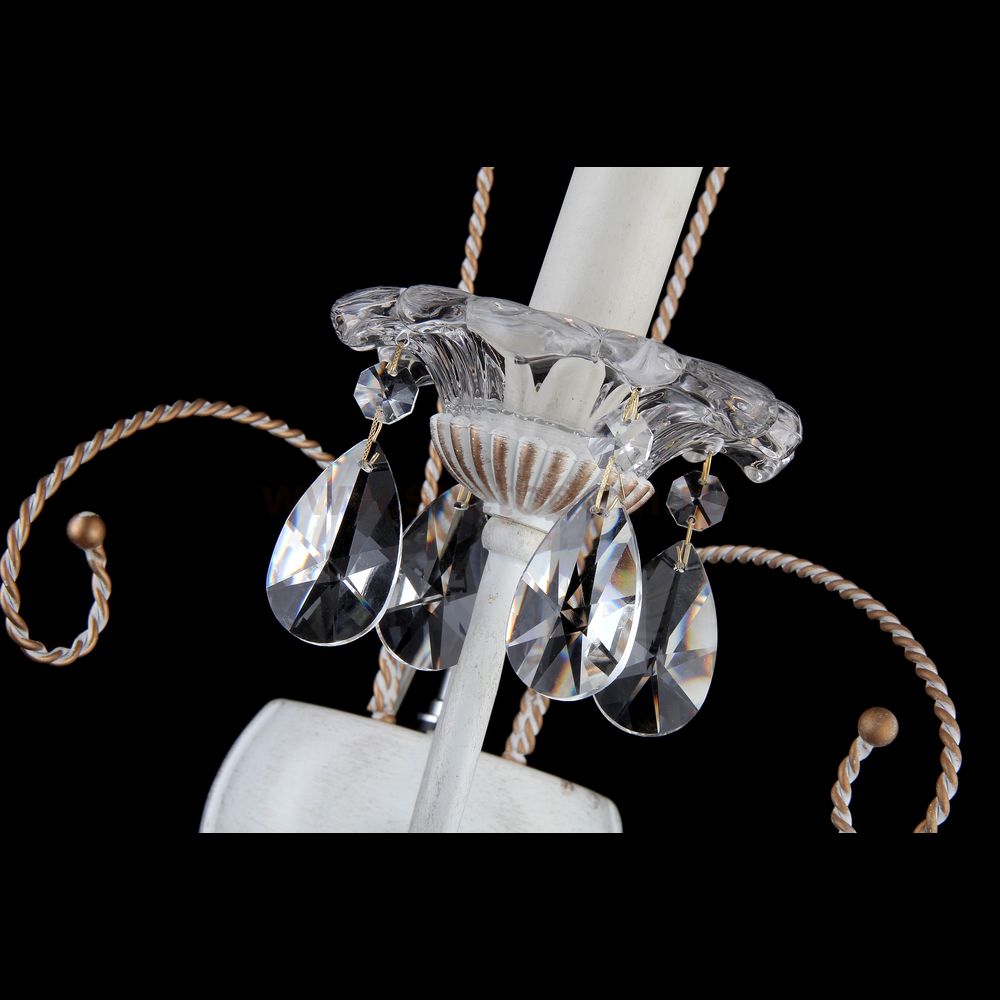 Арматура из металла цвета «белое золото». Декоративный элемент ручной работы в основании люстры. Абажуры из плиссированной органзы. Резные подсвечники и подвески из *хрусталя. Комментарий