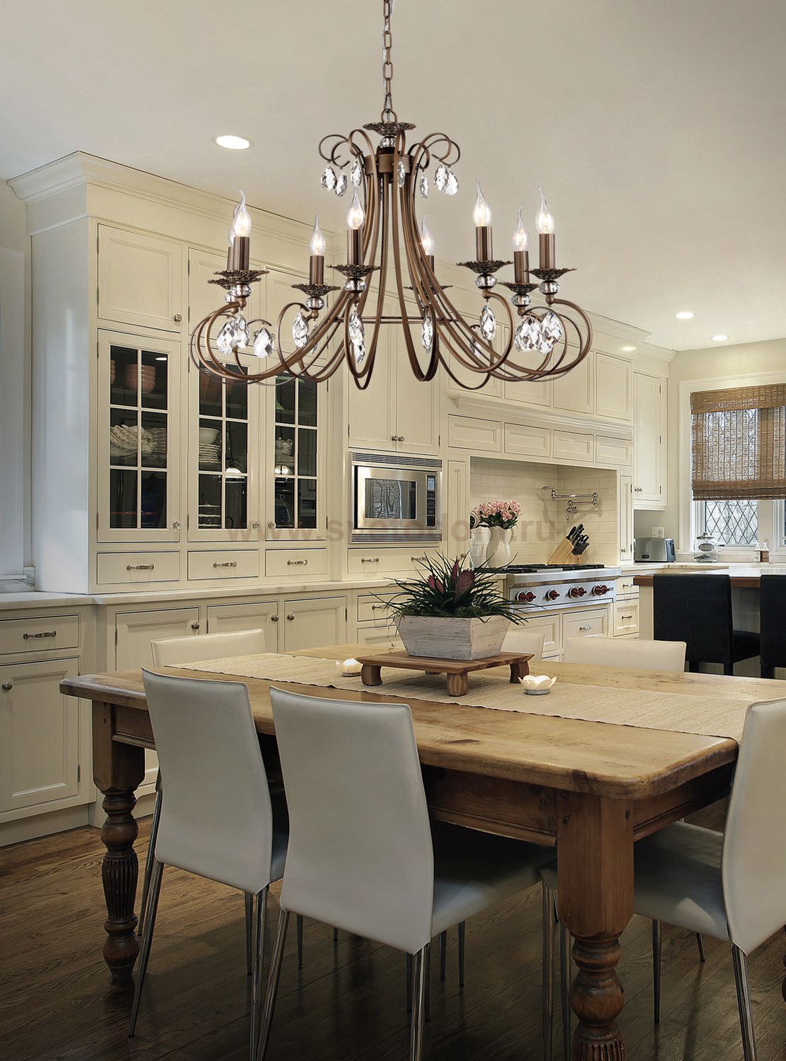 Завораживающая взгляд хрустальная люстра выставлена в продажу немецким брендом Майтони. Она, как несложно заметить на фото, относится к классическому типу световых приборов, и содержит в себе восемь плафонов – свечек, располагающихся каждая на отдельном рожке витого бронзового каркаса. Теплый свет от лампочек позволит вам организовать достаточно объемное освещение в любой из комнат. Заметьте, что стоимость комплекта ламп не вошла в заявленную компанией Maytoni цену. Поэтому постарайтесь купить его дополнительно к хрустальной люстре Maytoni Elegant ARM280-08-R. |
