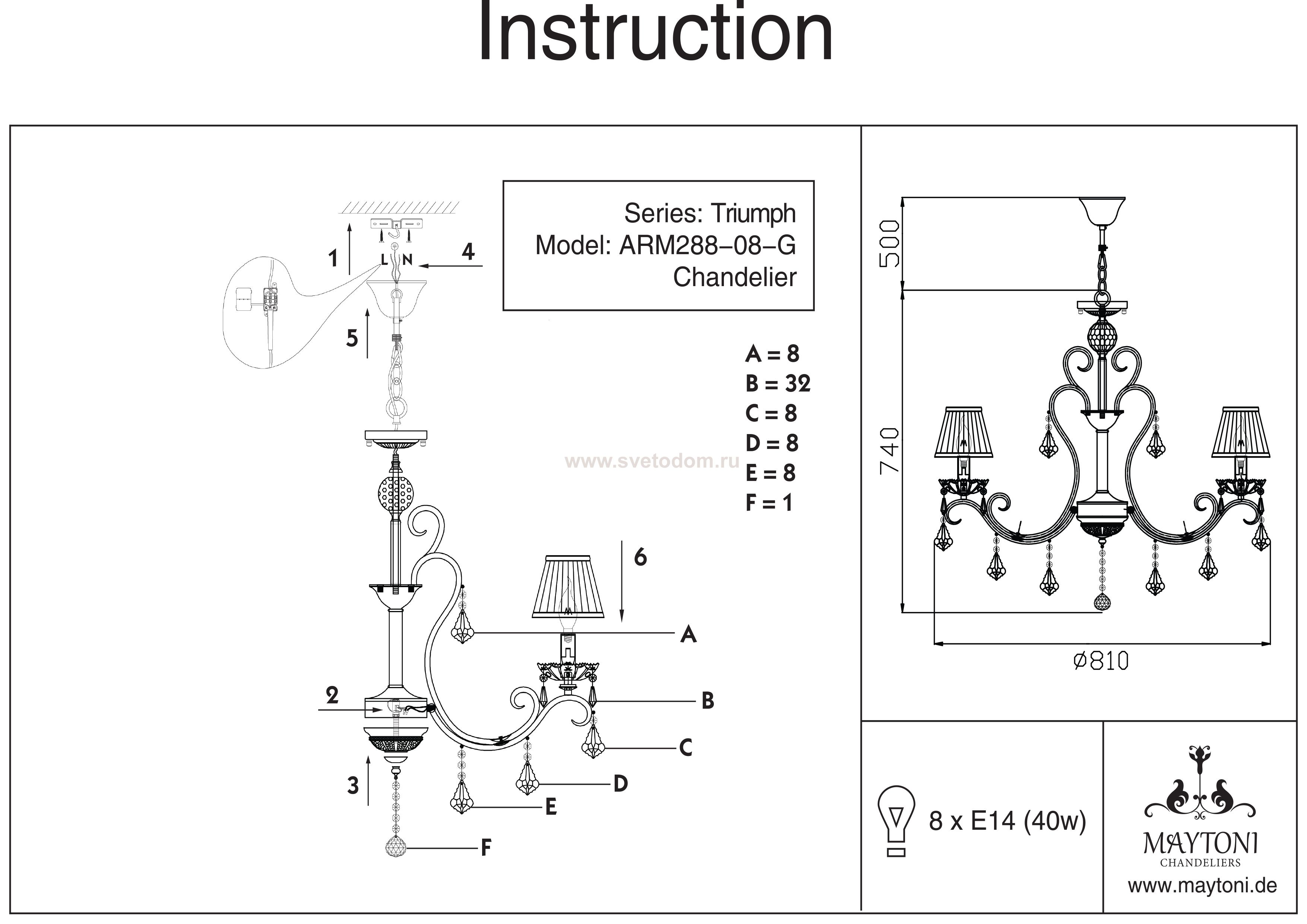 Особенности модели ARM288-08-G: Светильники серии, декорированные кристаллами, отличаются торжественным внешним видом. Они не оставят равнодушными любителей классики. Металлический каркас выкрашен в кремовый цвет. Его фактура и графичность линий подчеркнута золотистой патиной. Абажуры из органзы изготовлены по технологии намотки. Универсальное крепление "2 в 1" позволяет монтировать люстры с использованием цепи или без нее.