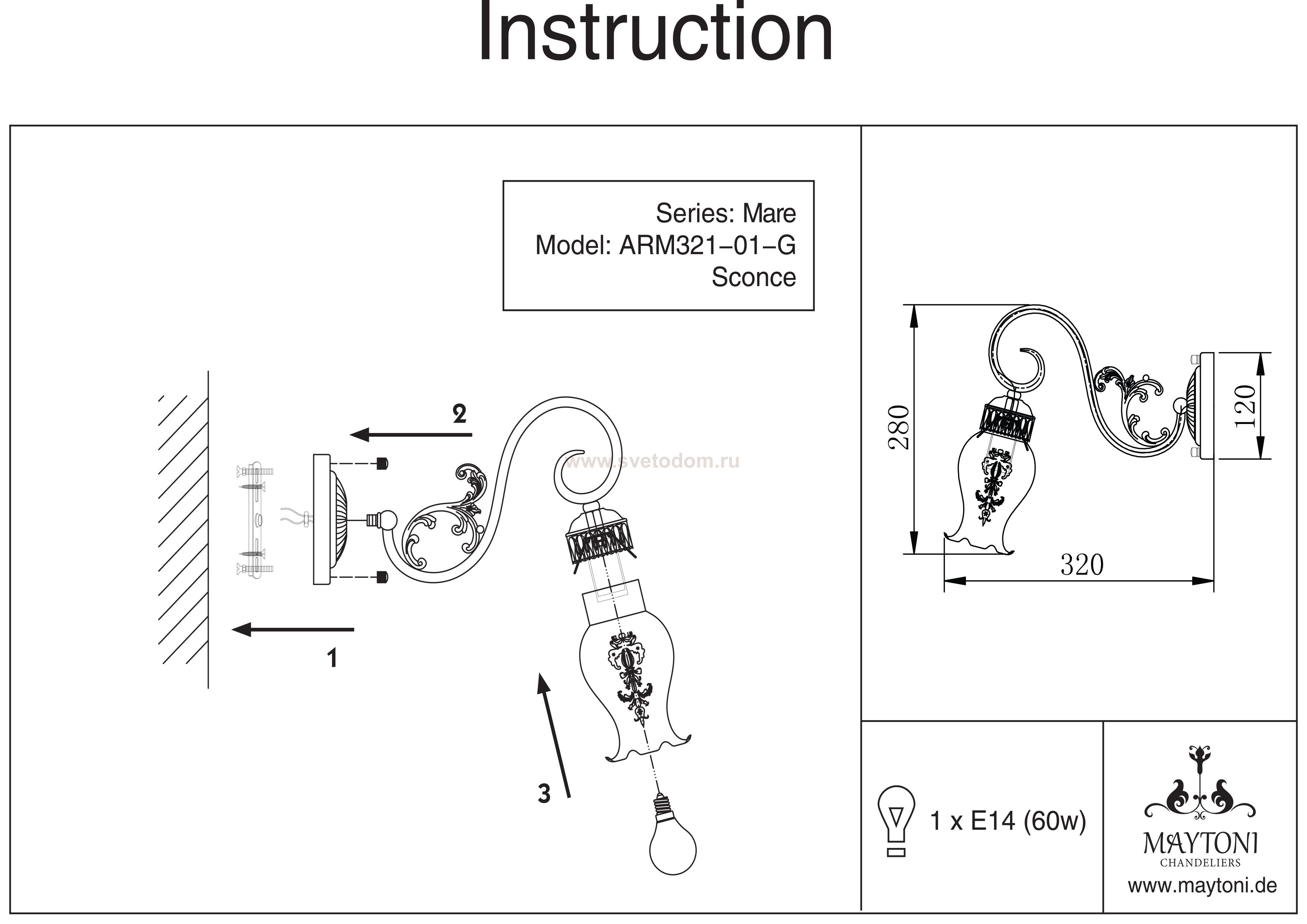 Когда видишь это настенное бра Maytoni ARM321-01-G, которое может служить прекрасным приобретением, первой ассоциацией становится нежный цветок колокольчика. Классический дизайн плюс изящная простота — и получилось превосходное украшение для небольшого помещения. Это изделие немецкой фирмы Майтони имеет небольшую стоимость, но благородный цвет белое золото, в котором выполнено это настенное бра, и плафон в виде цветка производят очень хорошее впечатление, что мы и видим на фото. Цена указана тут же на страничке. Крепится бра к стене при помощи монтажной пластины. Также для бра Maytoni понадобится купить одну лампочку Е14. |