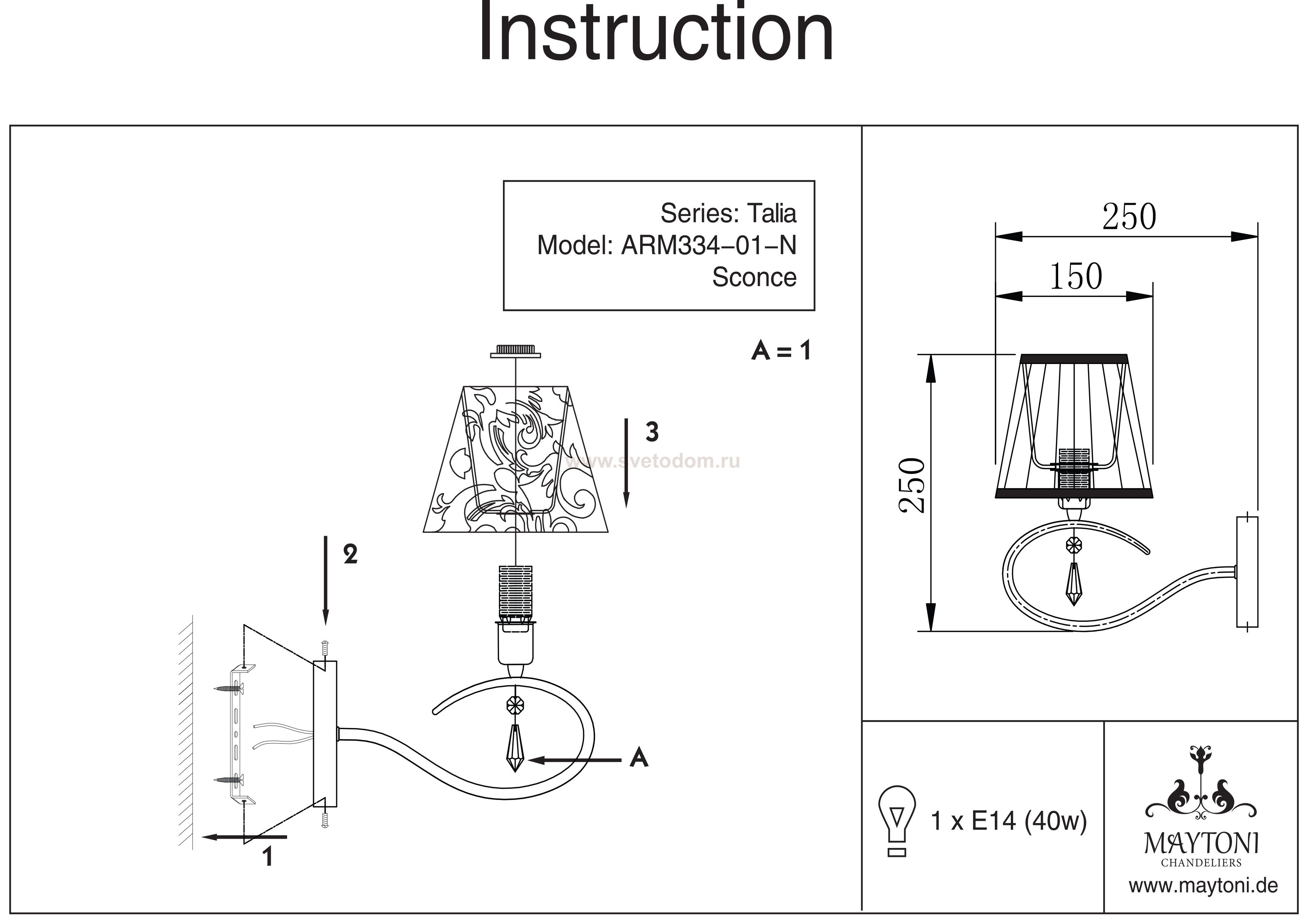 Светильник Maytoni ARM334-01-N Talia на протяжении многих лет притягивает к себе искушенных дизайнеров и клиентов, обустраивающих квартиру или загородный дом, а также офисные или общественные места. Благодаря эстетической тонкости и технической проработанности германская модель ARM334-01-N популярна в онлайн продажах на сайте и в наших "земных" магазинах сети Светодом.