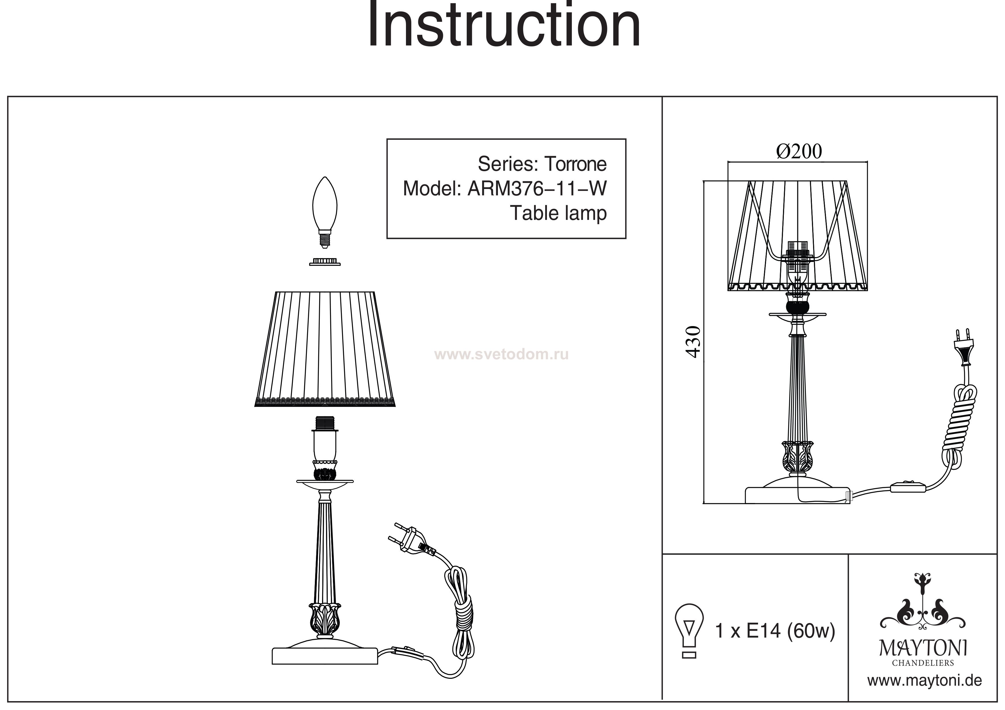 Изображённая на фотографии декоративная настольная лампа, которую предлагает купить по приемлемой цене немецкая компания Майтони, изготовлена в классическом стиле ампир. Её круглое основание, как и рельефная ножка, изготовлены из металлической арматуры цвета белого золота. А плафон диаметром 200 миллиметров выполнен из ткани. Декоративная настольная лампа Maytoni ARM376-11-W использует одну лампочку мощностью 40 ватт, |