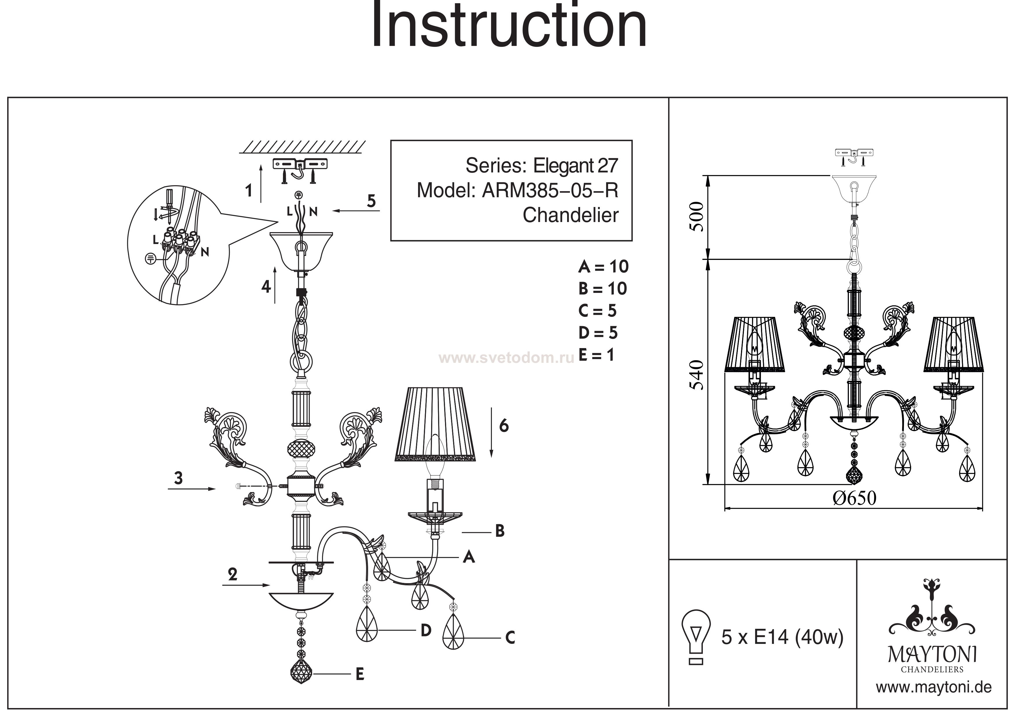 В указанной на фото хрустальной подвесной люстре присутствует пять плафонов. Все они выполнены из бежевого текстиля и украшены фактурной каймой. Арматура изделия от Майтони сделана из металла матово-коричневого цвета. Это красиво контрастирует с плафонами и создает эффект благородной изысканности. Хрустальная подвесная люстра Maytoni ARM385-05-R украшена восхитительными каплевидными подвесками. Также хрустальными подставками, имитирующими подсвечники, оформлены и плафоны. Обратите внимание: в стоимость люстры от Maytoni цена лампочек не входит, поэтому не забудьте купить их дополнительно.