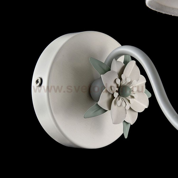 Арматура из металла. Множество декоративных элементов: ажурные ленты, цветы, основание серого цвета. Абажур из ПВХ покрыт белой тканью. Дополнительно