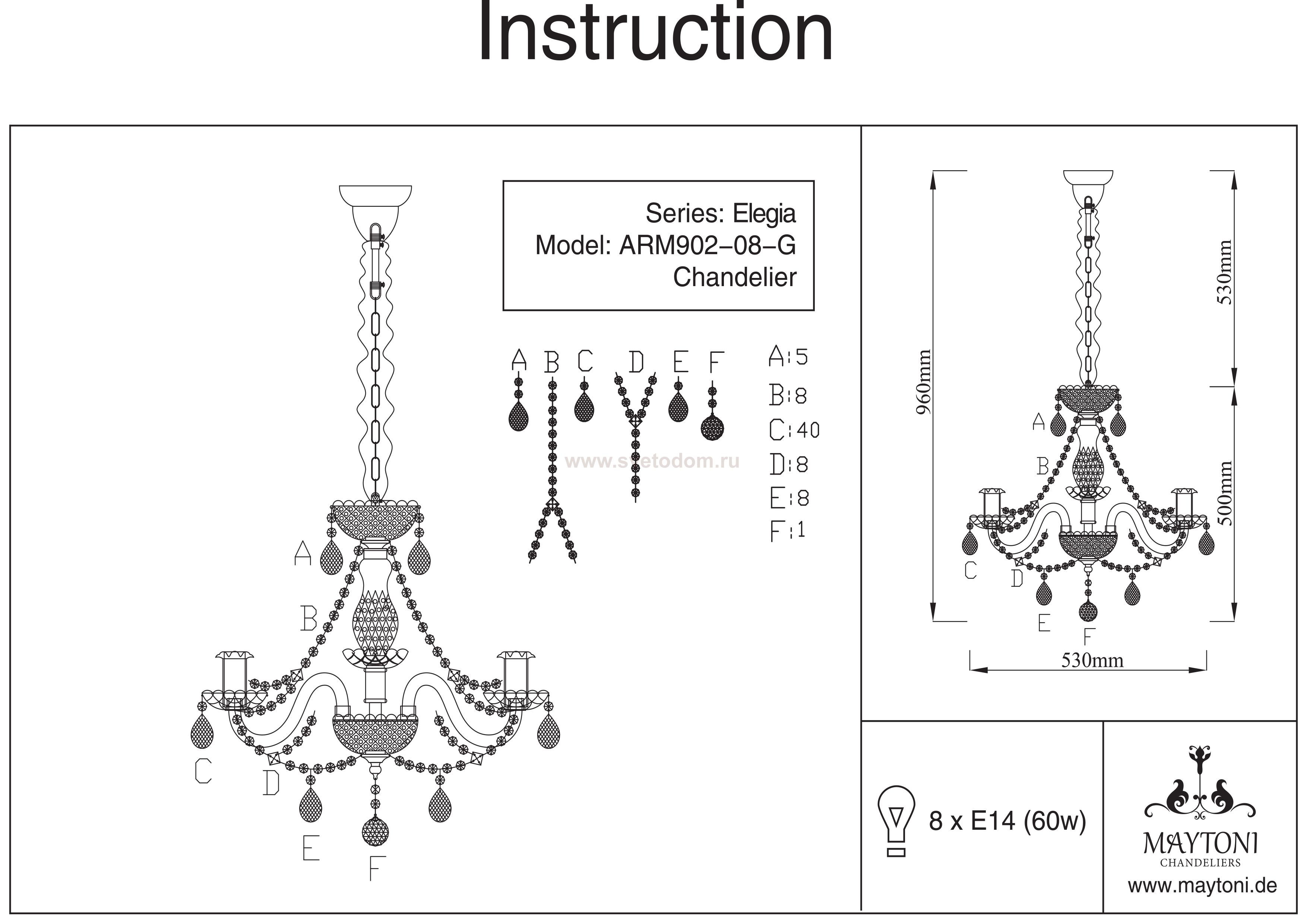 Купить мощный классический прибор, конструкцию которого можно изучить с помощью фото, можно для роскошных просторных комнат, выполненных в помпезном традиционном стиле. Хрустальная люстра Maytoni Diamant Crystal ARM902-08-G отличается изящным дизайном и достаточно лояльной, приемлемой ценой. Стоимость предлагаемого комплекта от Maytoni не включает световые элементы подходящего цоколя, это необходимо учесть при заказе хрустальной люстры у наших операторов. Роскошь хрусталя отлично сочетается с благородством золоченого метла, из которого выполнена арматура, декорированная бархатной тканью. Канделябр усыпан стразами, различными по форме и размерам. Многочисленные грани подвесок и блюдец, несущих плафоны светильника от Майтони, играют сказочным светом, заставляя восхищаться столь фантастическим уникальным прибором. |