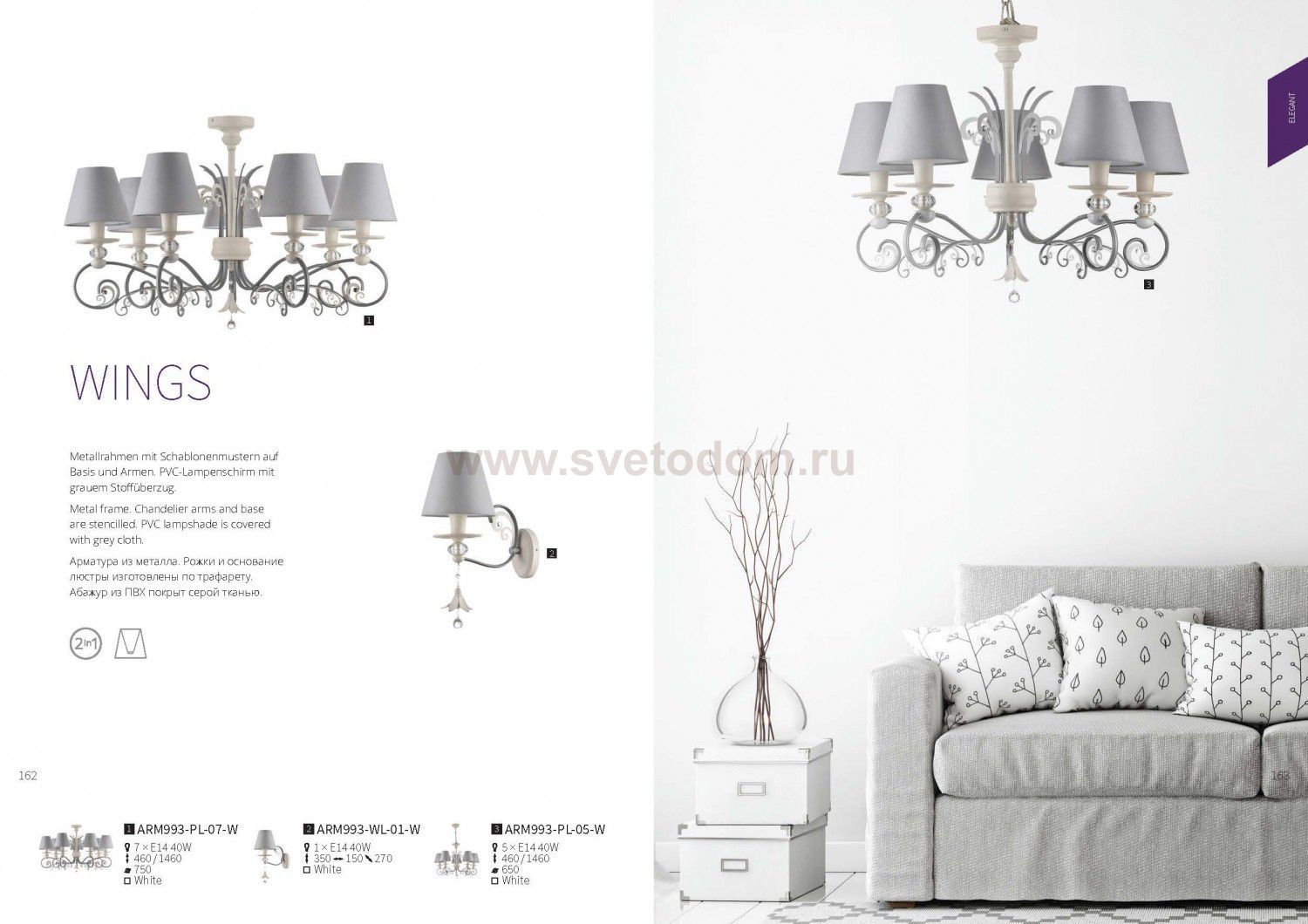 Особенности модели ARM993-PL-07-W: Арматура из металла. Рожки и основание люстры изготовлены по трафарету. Абажур из ПВХ покрыт серой тканью.