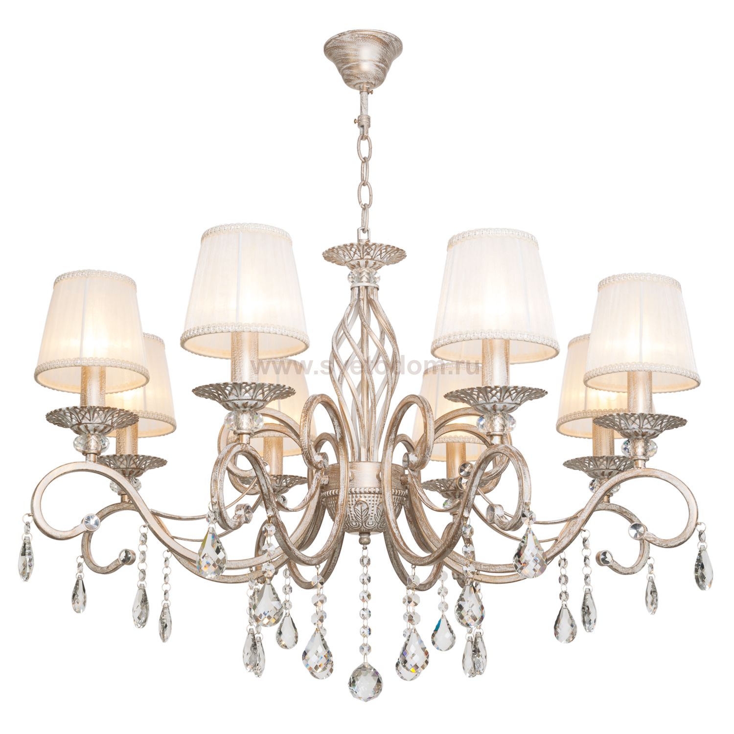 Люстра классическая с хрусталем B11196/8FGD+WT WT от бренда BenCrezo. Каркас выполнен из материала металл, цвет античный белый. Плафоны (светорассеиватели) выполнены из материала текстиль, цвет белый. Цоколь E14 рассчитан на лампы максимальной мощности до 40 Вт, а максимальная площадь освещения составит до 18 м?.