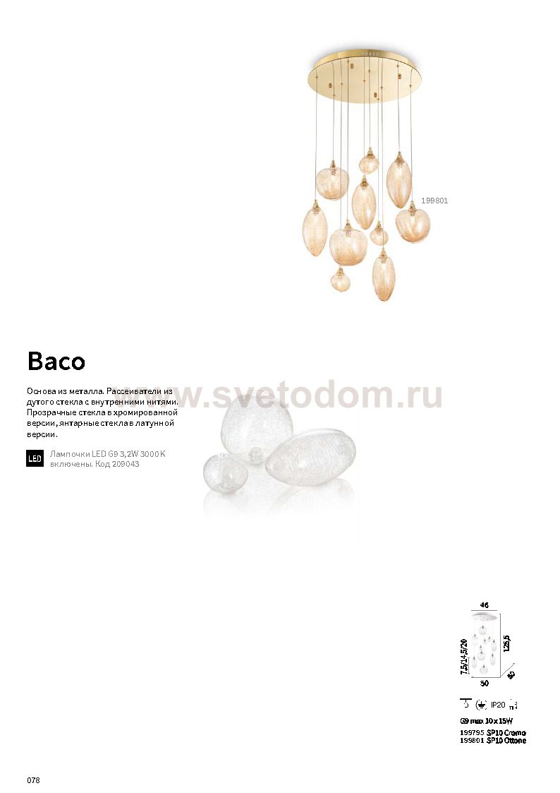 Подвесной светильник от известной итальянской фабрики Ideal lux из каталога Moderno в современном стиле под артикулом BACO SP10 OTTONE (199801) серии BACO имеет ряд отличительных характеристик: Основа из металла. Рассеиватели из дутого стекла с внутренними нитями. Прозрачные стекла в хромированной версии, янтарные стекла в латунной версии.