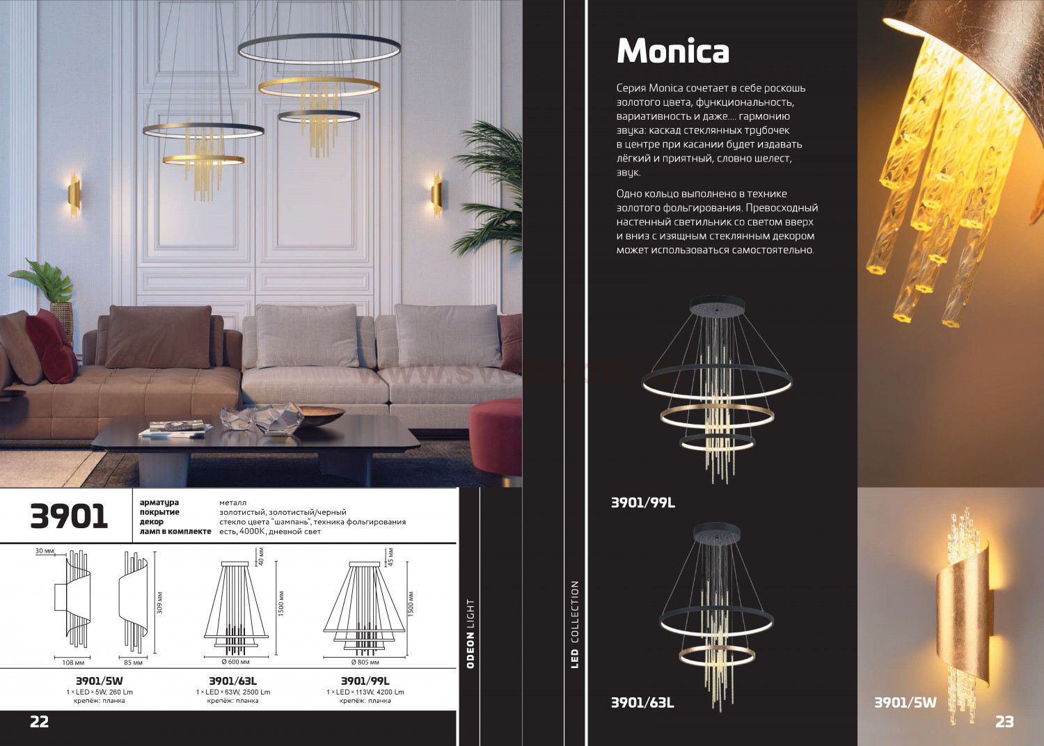 Линия Monica сочетает в себе роскошь и гламур золотого цвета, выполненного в технике фольгирования, и ... гармонию музыки ветра: каскад стеклянных трубочек в центре светильников при касании будет издавать лёгкий и приятный, словно шелест, звук. Подвесы могут состоять из двух и трех колец, в линии теперь есть потолочный светильник.
