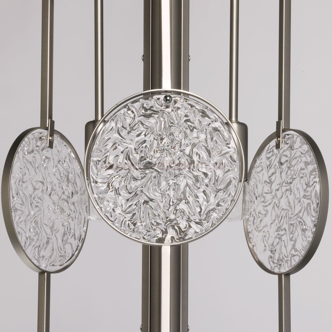 Подвесная люстра в цвете матового никеля выглядит стильно и современно. Оригинальные декоративные элементы из прозрачного фактурного стекла придают люстре уникальности, делают ее прекрасным дополнением к интерьеру. Возможность устанавливать комфортную высоту. Заменяемые источники света удобны в эксплуатации. Технология производства