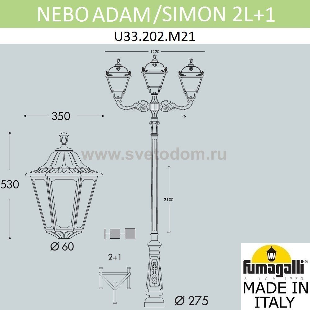 Касаемо артикула E35.202.M21.AYH27 важно знать - Парковый фонарь FUMAGALLI большого размера серии NOEMI, модель TABOR ADAM/NOEMI 2L+1. Парковый фонарь с 2 светильниками большого размера, на консолях ADAM большого размера, плюс 1 венчающий светильник, установленные на классическом столбе TABOR высотой 3,0 м (+высота фонарей на кронштейнах). Изготовлены в Италии, по уникальным технологиям "FUMATECH" из современного композитного полимера RESIN. Этот материал в 5 раз прочнее металла, не ржавеет, не окисляется, не выгорает на солнце, его не нужно красить. Все светильники пыле-влаго защищены по стандарту IP55 (Пылезащищенные, защита от водяных струй с любого направления). Рассеиватель выполнен из антивандального, не мутнеющего и не горючего PMMA (ПолиМетилМетаАкрилат). Срок службы светильника - не менее 20 лет. Температура использования от -60 до +90. В серии NOEMI есть садовые фонари в настенном (OFIR/NOEMI, MIRRA/NOEMI) подвесном (SICHEM/NOEMI) и наземном исполнении (IAFAET.R/NOEMI, ALOE.R/NOEMI, ARTU/NOEMI, GIGI/NOEMI, RICU/NOEMI, NEBO/OFIR/NOEMI 1L, NEBO/OFIR/ANNA 2L, TABOR/ADAM/NOEMI 3L) со столбами разной высоты, с разным количеством и конфигурацией голов. Консоли настенных фонарей и кронштейны светильников на столбах освещения могут устанавливаться в положение вверх и вниз. Столбы выше 150 см имеют в основе мощную стальную трубу с двойной оцинковкой. При заказе требуется выбрать цвет корпуса, цвет плафона и тип патрона (Е-27 или LED GX-53). Возможен светодиодный вариант. По стилю и дизайну серия уличных светильников NOEMI похожа на светильники среднего размера серии RUT и на светильники малого размера серии ANNA. По размеру относится к большим парковым светильникам как серия SIMON и GLOBE 400.