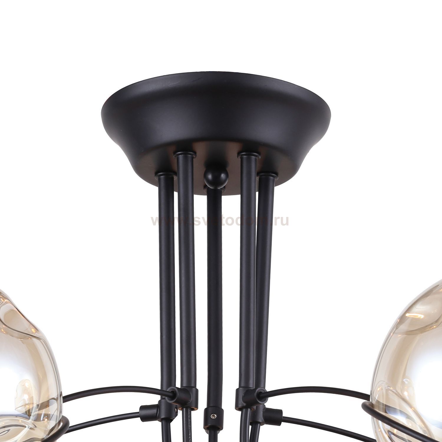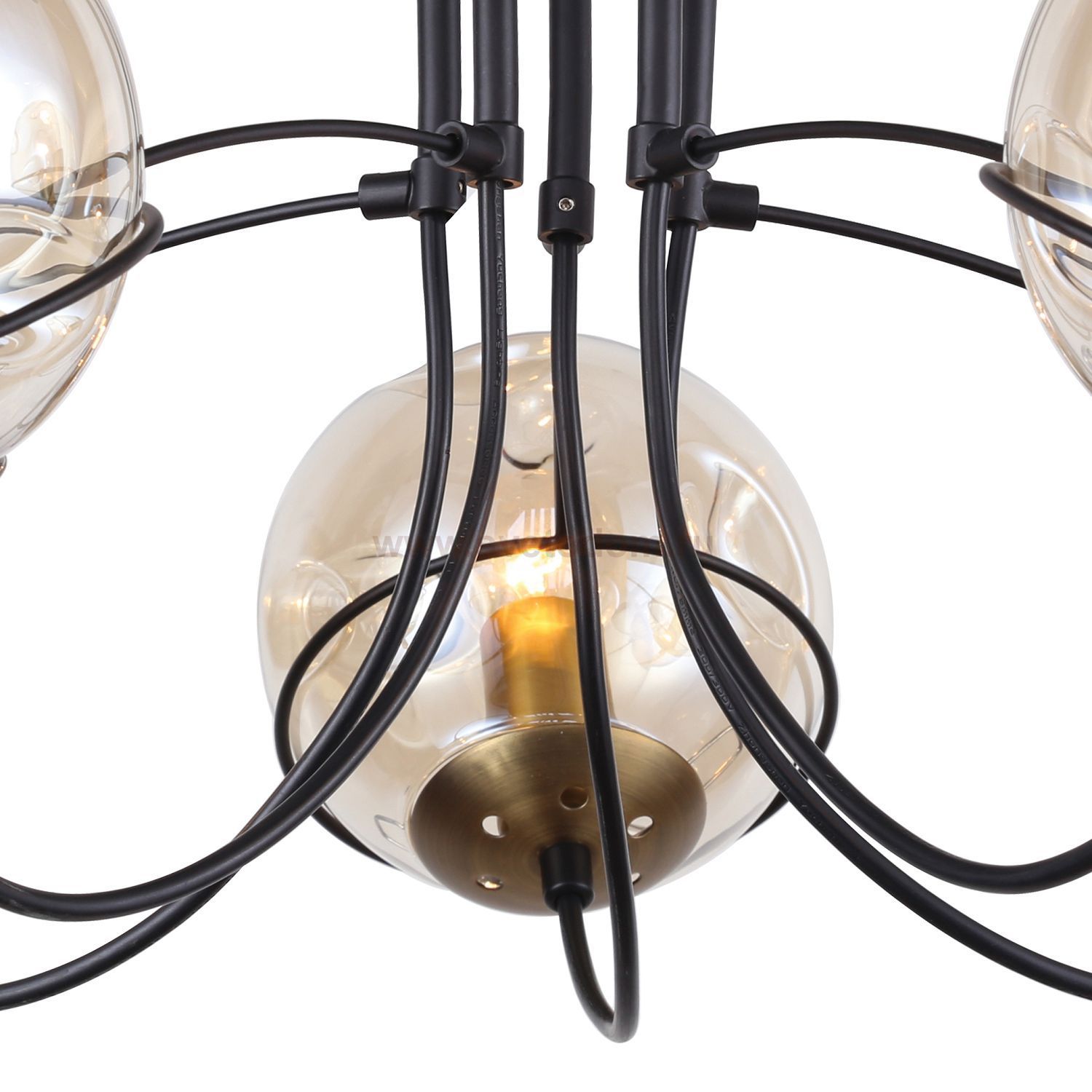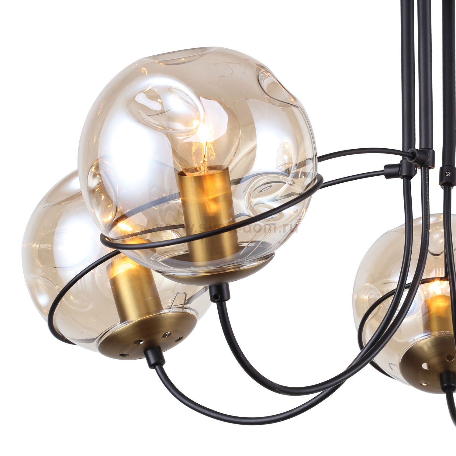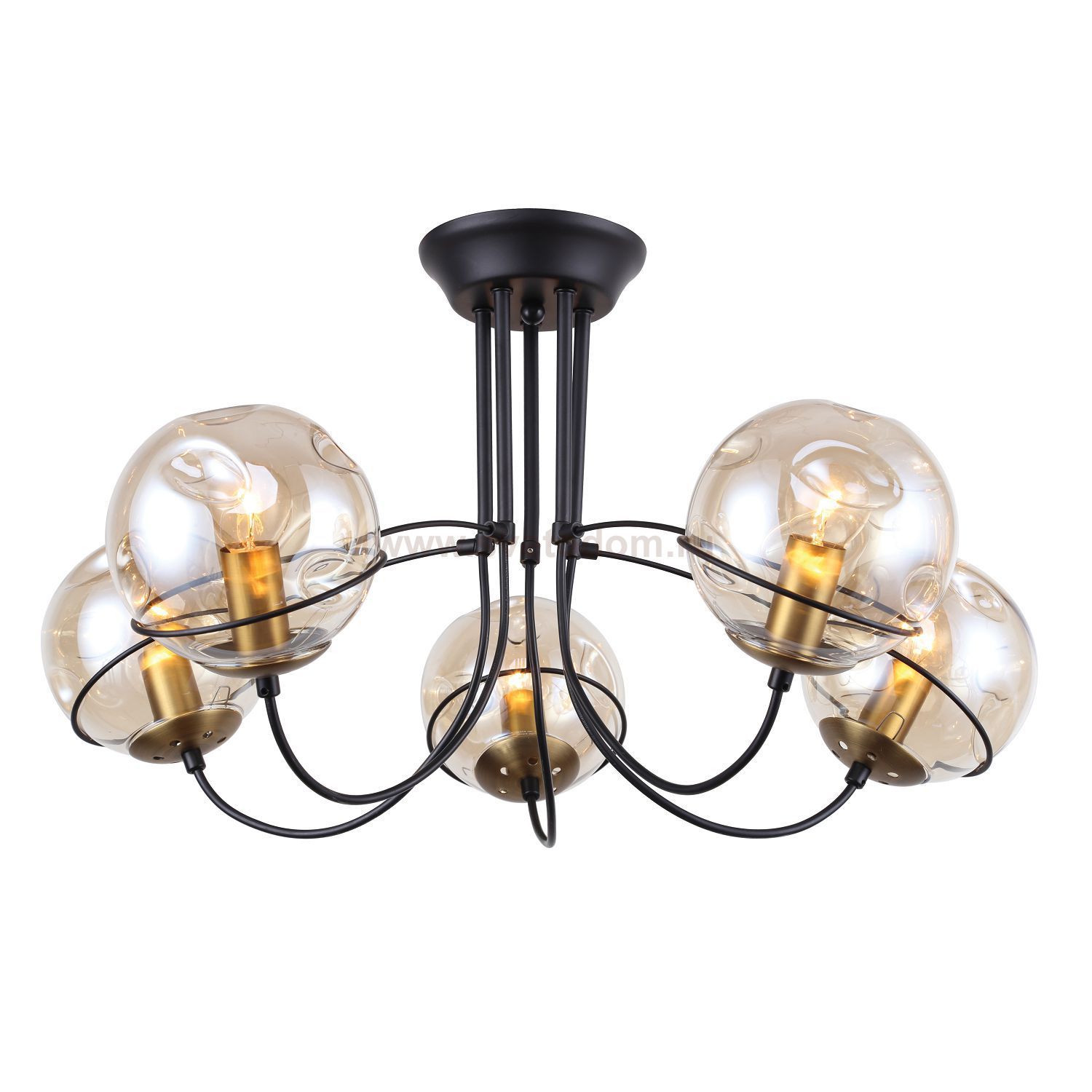 Каркас черного цвета оформлен выдувными плафонами янтарного цвета с эффектом деформированных пузырей. Материал плафона