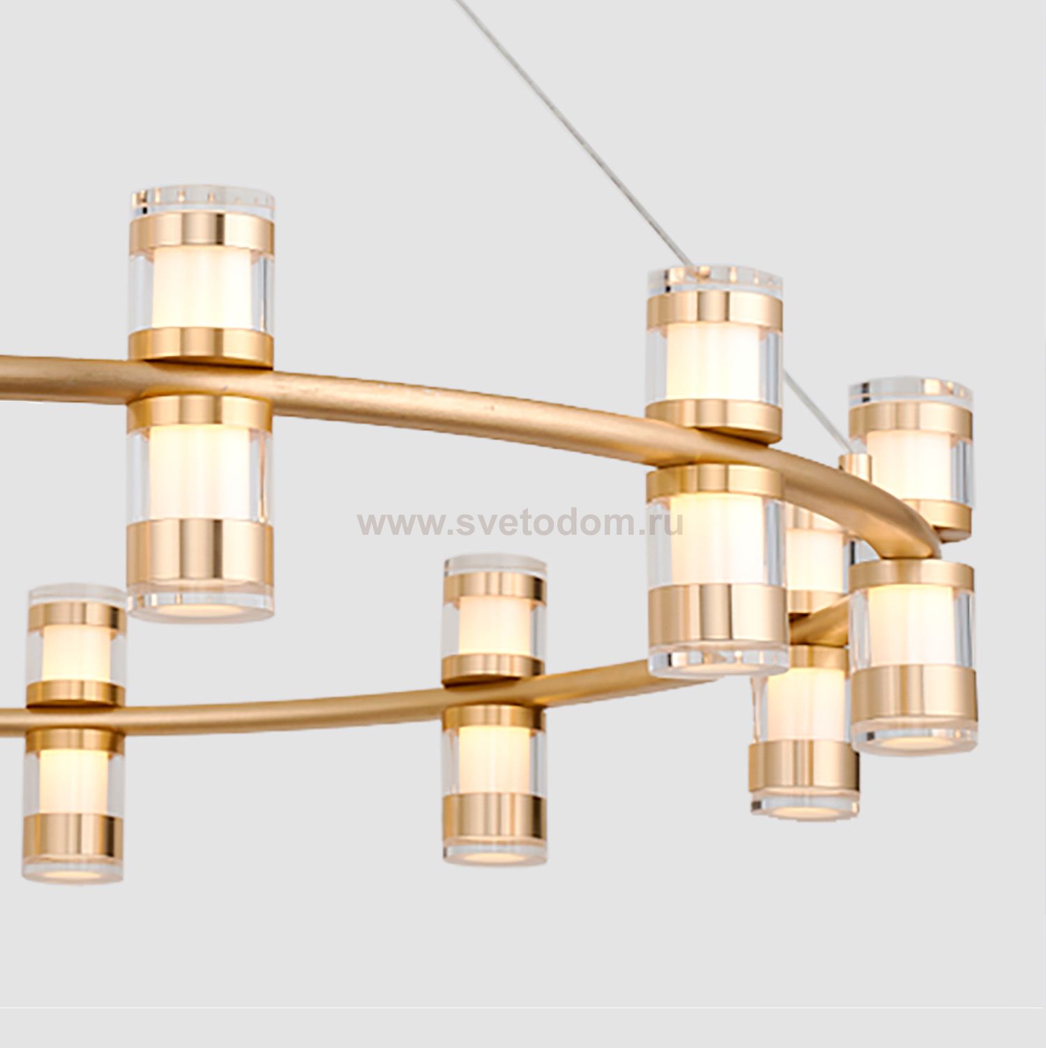 Подвесная люстра в золотом цвете, диаметром 80 см оснащена двусторонним многослойным стеклянным плафоном с светящимся цилиндром внутри и золотыми деко Декор