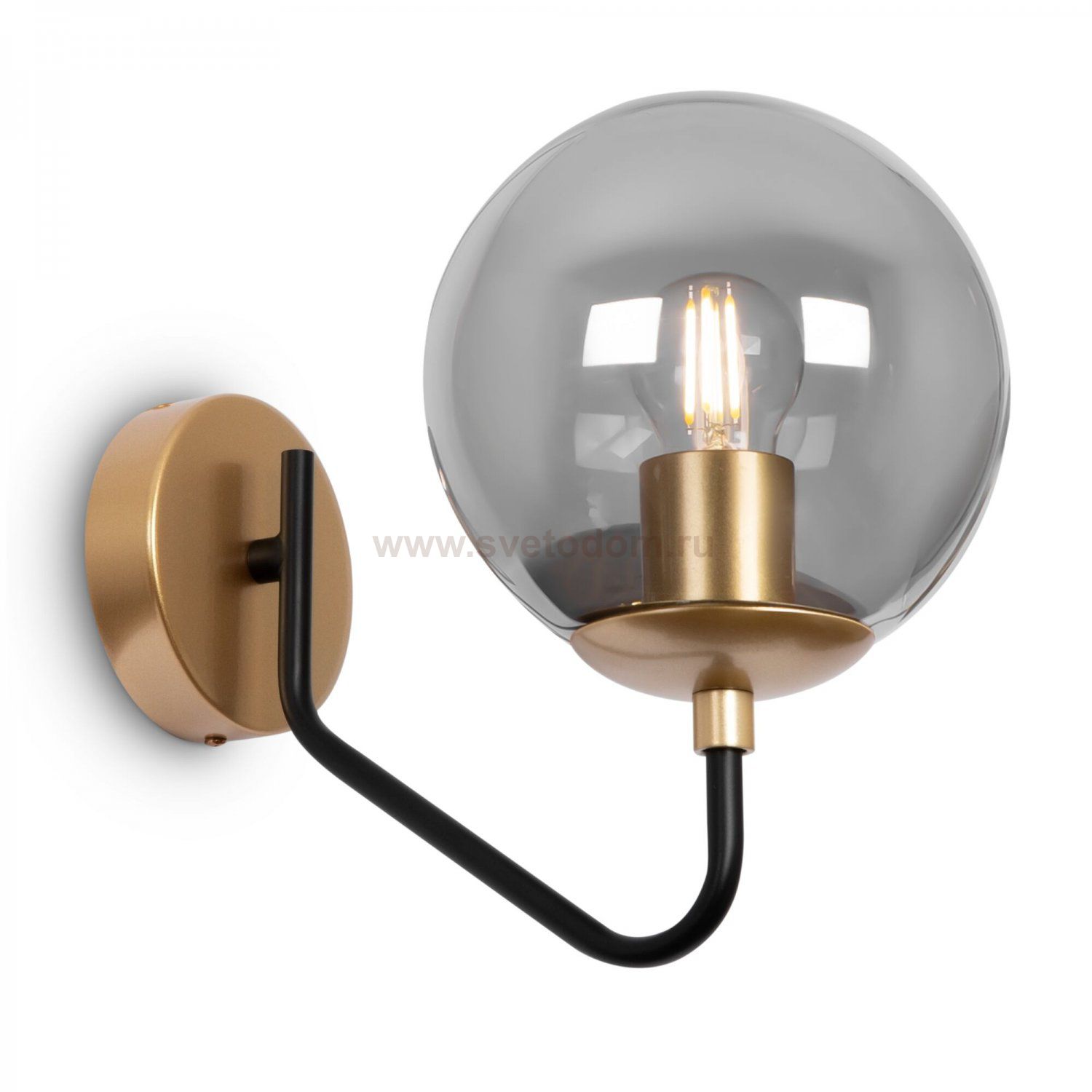 Металлическая арматура. Цвет – матовый черный с золотом. Плафоны-сферы из глянцевого стекла дымчатого оттенка. Широкий ассортимент для комплексного освещения. Источник света – лампа с цоколем E27.