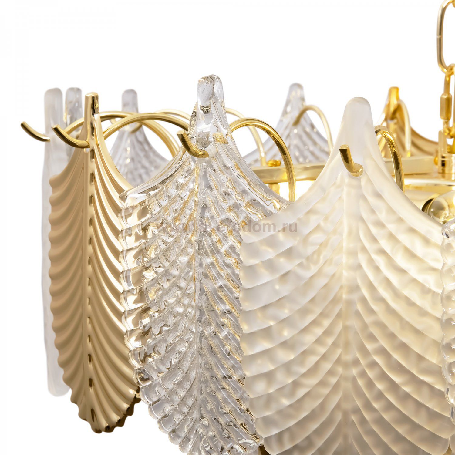 Металлическая арматура. Цвет – французское золото. Декор – рельефные лепестки двух видов: в тон арматуре и из прозрачного фактурного стекла. Современная интерпретация флористического дизайна. Источник света – лампа с цоколем Е14.