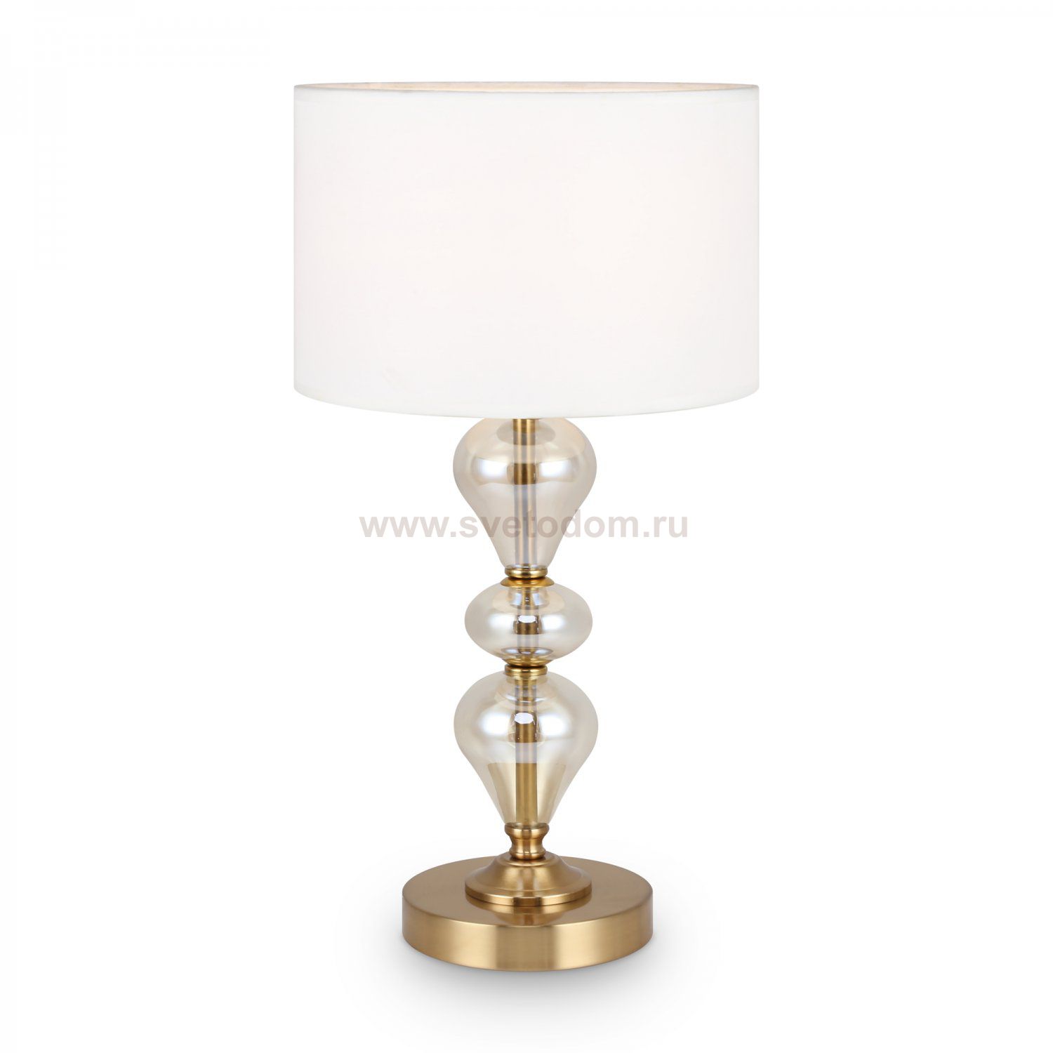 Арматура из металла, цвет — латунь. Плафоны — тканевые, молочного цвета. Металлическая конструкция декорирована выдувными стеклянными элементами с перламутровым напылением. Источником света служит лампа с цоколем Е14.