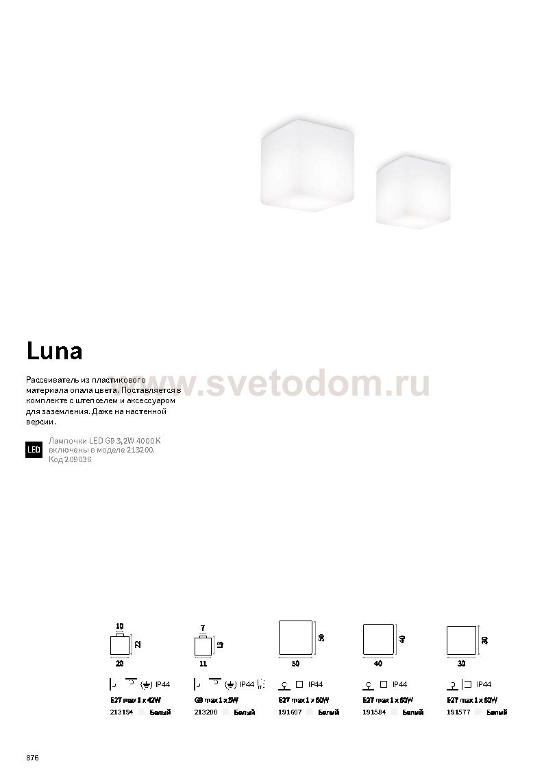 Потолочный светильник от известной итальянской фабрики Ideal lux из каталога Esterno в современном стиле под артикулом LUNA PL1 MEDIUM (213194) серии LUNA имеет ряд отличительных характеристик: Рассеиватель из пластикового материала опала цвета. Поставляется в комплекте с штепселем и аксессуаром для заземления. Даже на настенной версии.