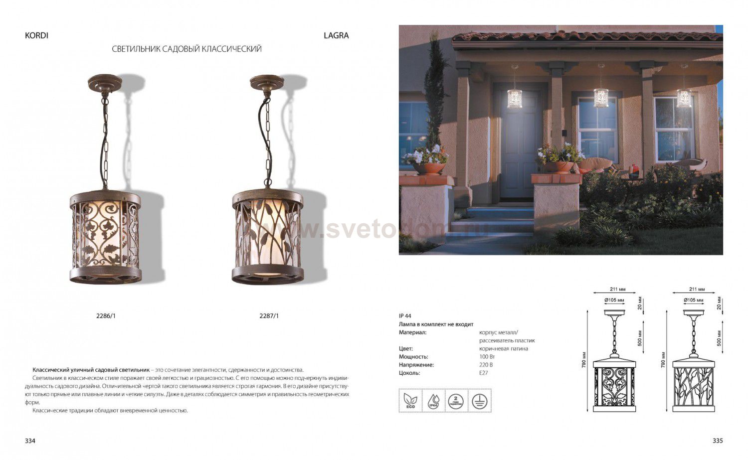 Уличный подвесной светильник 2287/1 линии Lagra выполнен в стиле модерн. Цвет покрытия металла: коричневый с золотой патиной. Плафон состоит из нескольких толстых матовых стекол, снаружи украшенный декоративной решеткой с изящным узором в виде тонких стеблей с бутонами. Имеется степень защиты IP44. Цоколь E27. Мощность 1*100W. Нет ламп в комплекте.