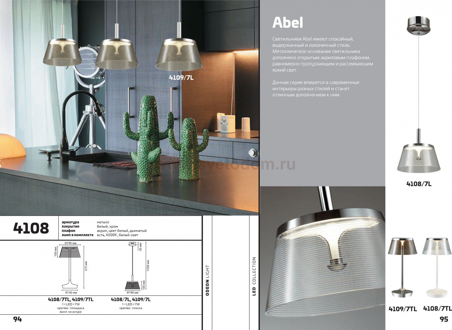 Храктерная особенность артикула 4109/7TL: Светильники Abel имеют спокойный, выдержанный и лаконичный стиль. Металлическое основание светильника дополнено открытым акриловым плафоном, равномерно пропускающим и рассеивающим яркий свет. Данная серия впишется в современные интерьеры разных стилей и станет отличным дополнением к ним