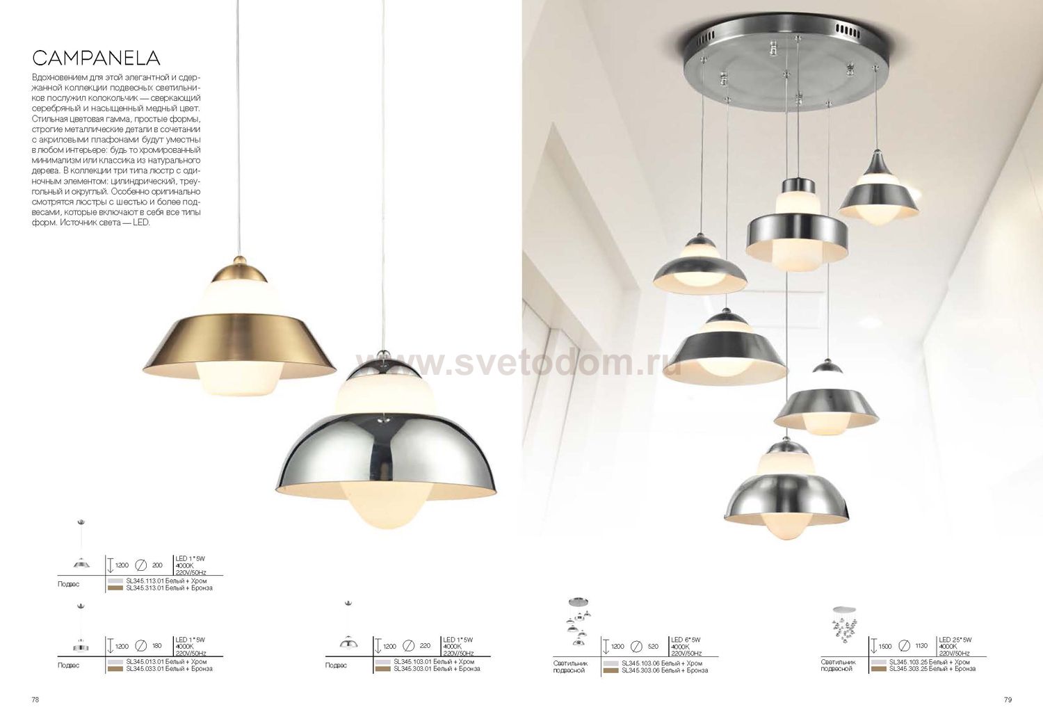 Если Вы настроены купить светильник модели SL34501301, то обратите внимание: Вдохновением для этой элегантной и сдержанной коллекции подвесных светильников послужил колокольчик – сверкающий серебряный и насыщенный медный. Стильная цветовая гамма, простые формы, строгие металлические детали в сочетании с акриловыми плафонами будут уместны в любом интерьере: будь то хромированный минимализм или классика из натурального дерева. В коллекции три типа люстр с одиночным элементом: цилиндрический, треугольный и округлый . Особенно оригинально смотрятся люстры с шестью и более подвесами, которые включают в себя все типы форм.