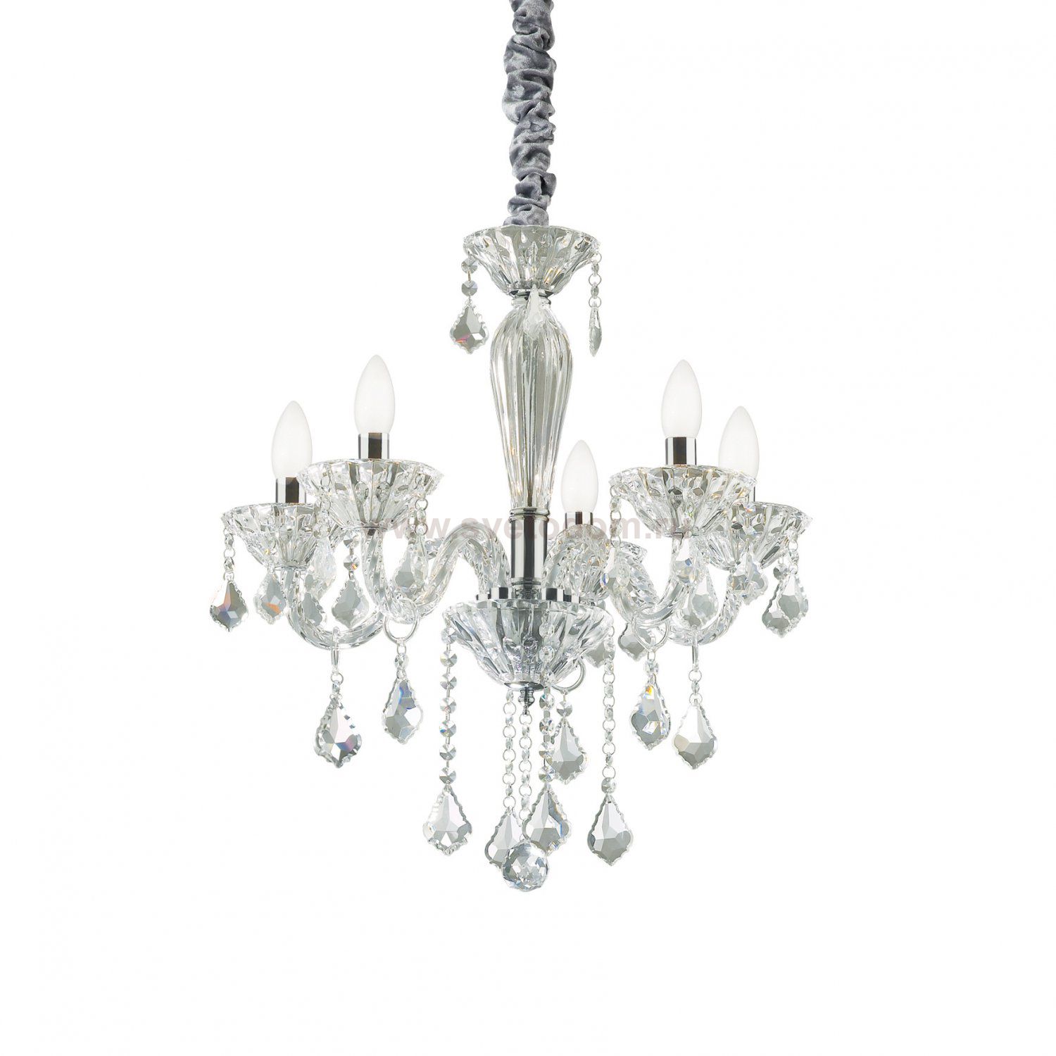 Люстра от известной итальянской фабрики Ideal lux из каталога Classico в венецианском стиле под артикулом TIEPOLO SP5 (34713) серии TIEPOLO имеет ряд отличительных характеристик: Люстра из дутого стекла ручной работы с элементами из хромированного металла. Подвески и капельки из хрусталя с фацетной огранкой. Цепь скрыта бархатной цепью.