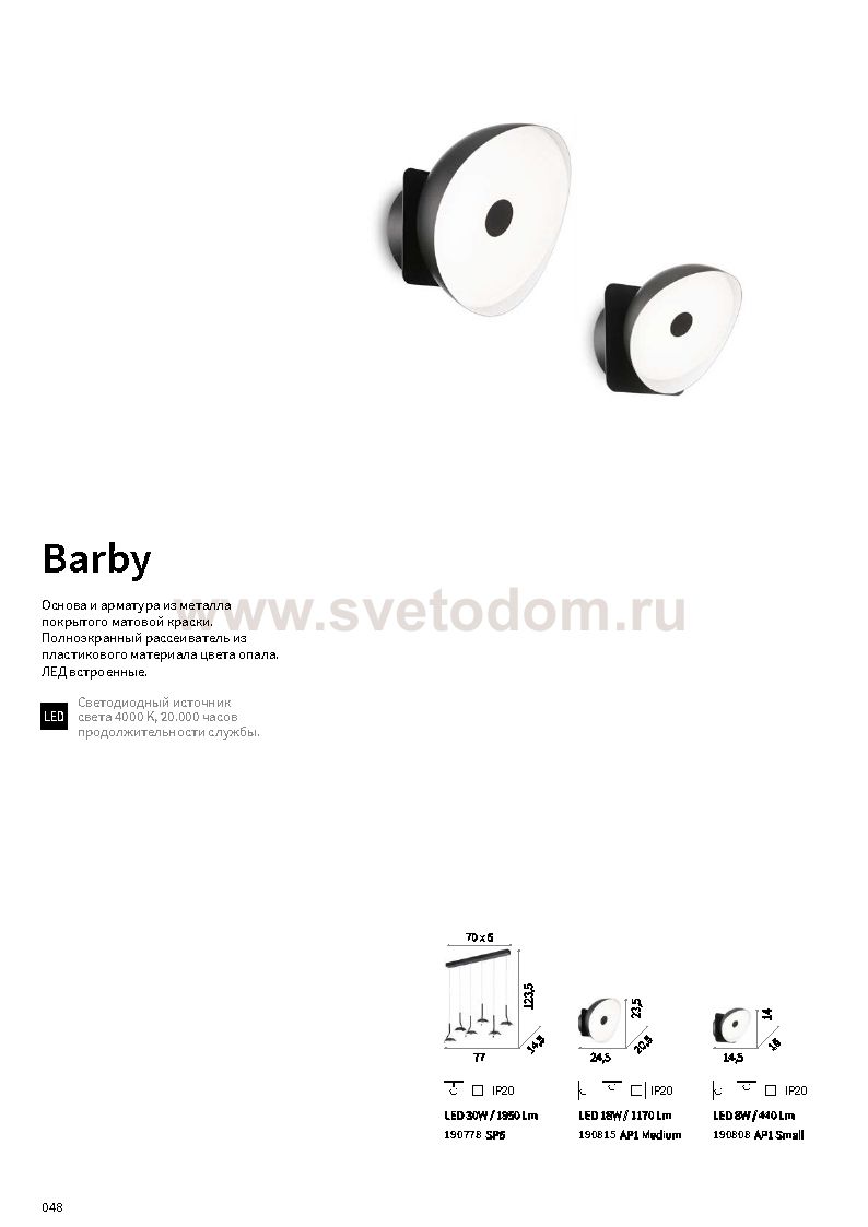 Светильник бра от известной итальянской фабрики Ideal lux из каталога Moderno в современном стиле под артикулом BARBY AP1 MEDIUM (190815) серии BARBY имеет ряд отличительных характеристик: Основа и арматура из металла покрытого матовой краски. Полноэкранный рассеиватель из пластикового материала цвета опала. ЛЕД встроенные.
