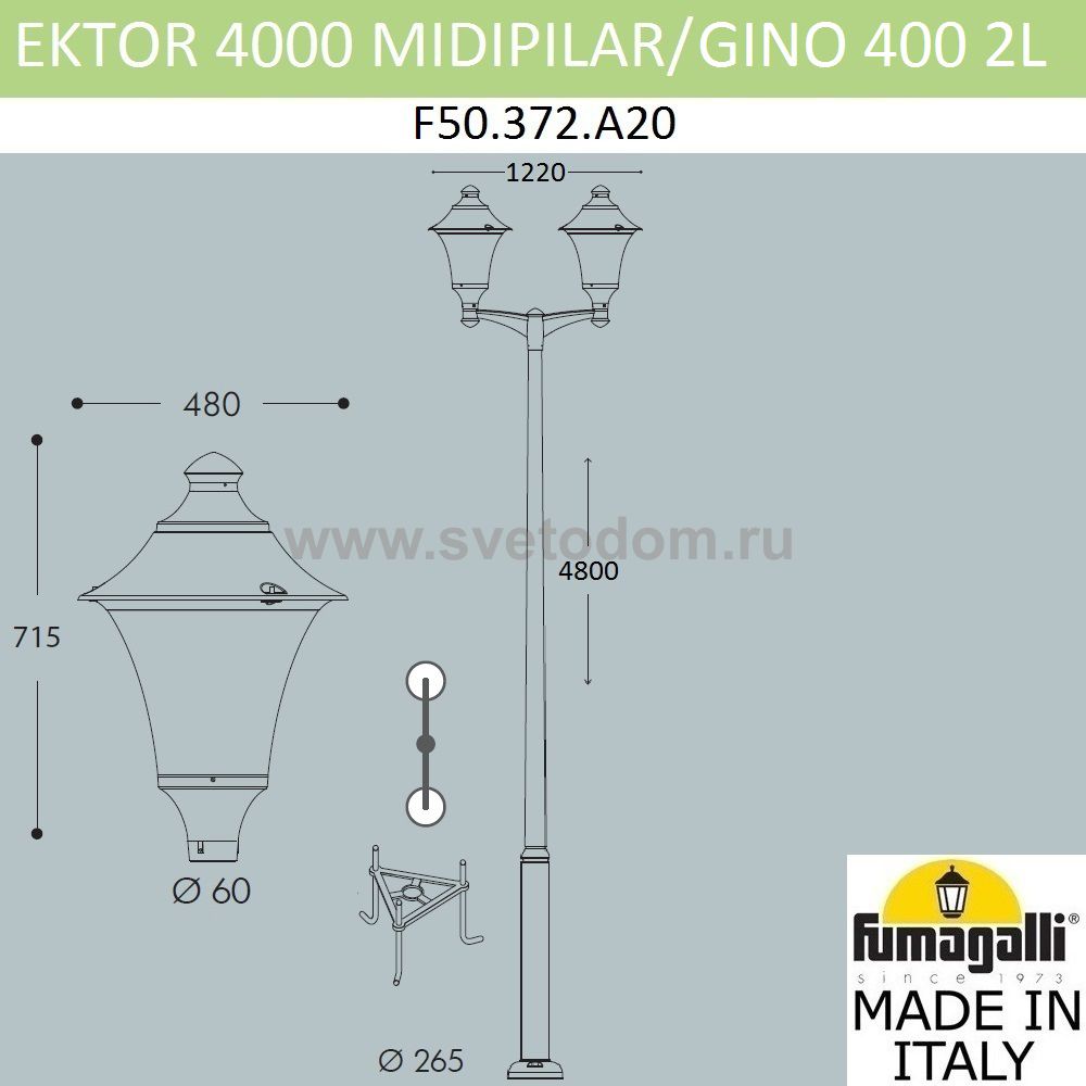 Касаемо артикула F50.372.A20.AXE27 важно знать - Парковый фонарь FUMAGALLI большого размера серии GINO, модель EKTOR/MIDIPILAR/GINO 2L. Светильник большого размера в современном стиле на столбе EKTOR с консолью MIDIPILAR 2L. Предназначен для освещения парковых дорожек, cкверов, садовых и ландшафтных композиций, и других общественных пространств. Используется в качестве основного уличного освещения на городских улицах и площадях. Изготовлены в Италии, по уникальным технологиям "FUMATECH" из современного композитного полимера RESIN. Этот материал в 5 раз прочнее силумина, не ржавеет, не окисляется, не выгорает на солнце, его не нужно красить. Все светильники пыле-влаго защищены по стандарту IP65 (Пыленепроницаемые, защита от водяных струй с любого направления). Рассеиватель выполнен из антивандального, не мутнеющего и не горючего PMMA (ПолиМетилМетаАкрилат). Срок службы светильника - не менее 20 лет. Температура использования от -60 до +90. В серии GINO есть ландшафтные фонари в настенном (MIDIPILAR/GINO) и наземном исполнении (NEW LOT/GINO, AKILLE/GINO) со столбами разной высоты, с разным количеством и конфигурацией голов. Консоли настенных фонарей и кронштейны светильников на столбах освещения устанавливаются только в положение "вверх". Столбы имеют в основе мощную стальную трубу с двойной оцинковкой и монтажный люк. Закладные элементы- в комплекте. Для устройства подвесного ландшафтного освещения предлагаем купить модель LUIGI 400-DR HIGH POWER LED с возможностью регулирования подвеса на любой высоте. При заказе требуется выбрать цвет корпуса, цвет плафона и тип ламп ("FUMAGALLI" E27 HIGH POWER LED 50W или матрицу "FUMAGALLI" GX-53 10W 1200Lm x 6).