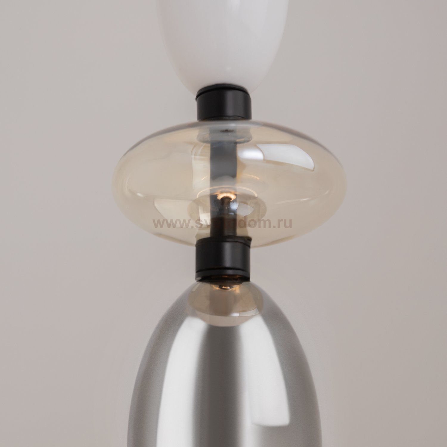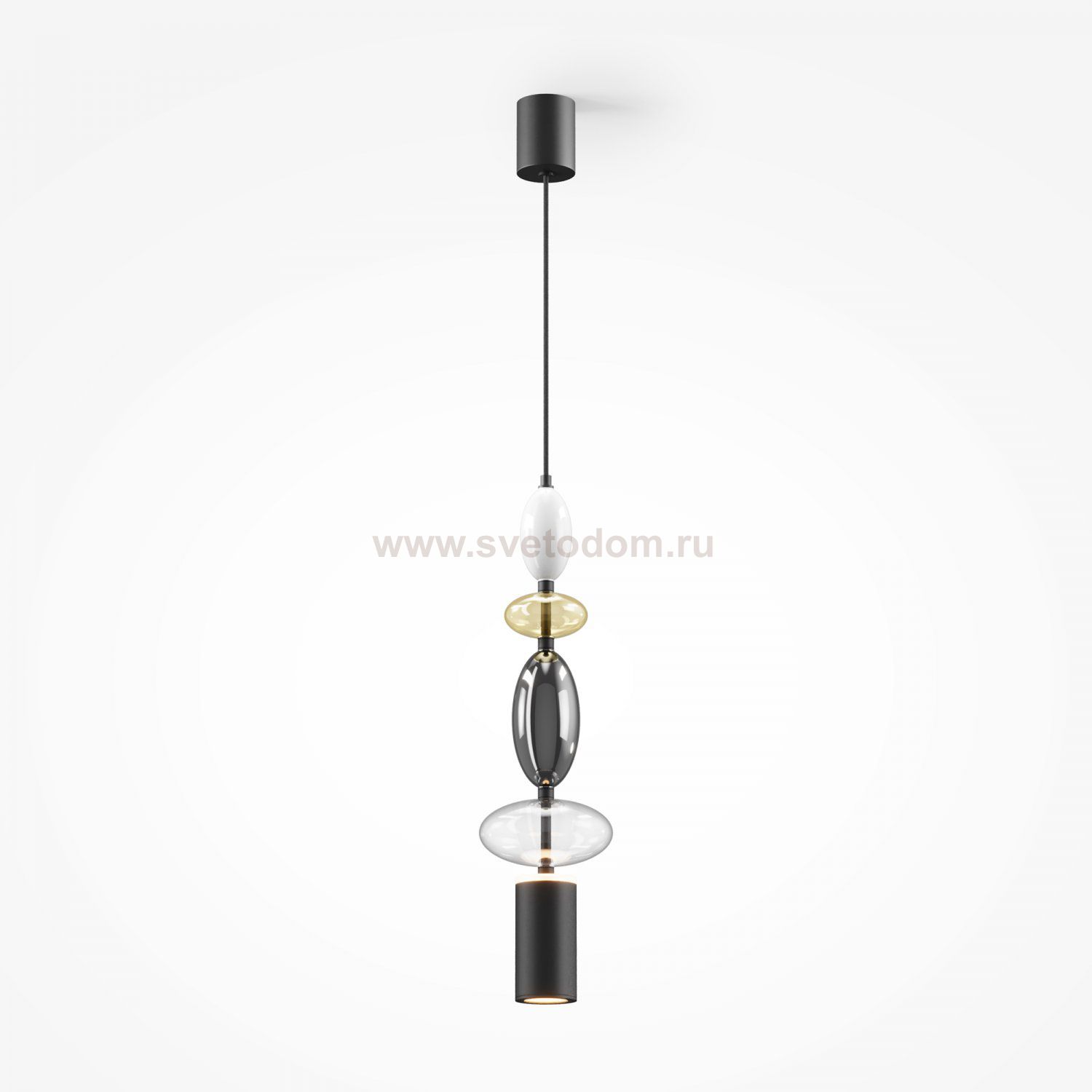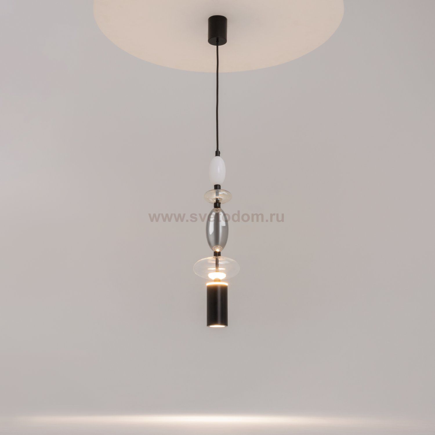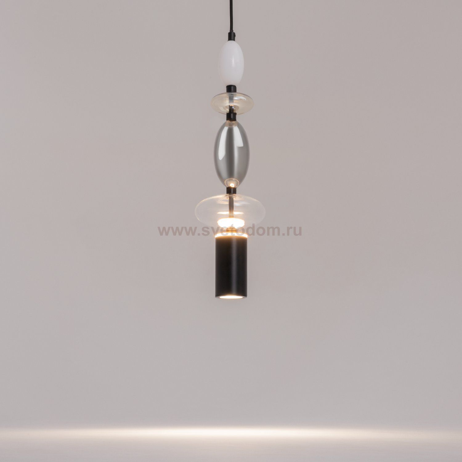 Черная металлическая арматура. Плафоны из стекла коньячного, белого, дымчатого цвета и прозрачный. Источник света комбинированный: нижний - съемная лампа с цоколем GU10, верхний - встроенный LED. Цветовая температура светильников 2700К, угол рассеивания света 120 градусов. Высота регулируется с помощью провода длиной 3 м. Монохромный дизайн, стеклянные элементы впишутся в различные стили интерьеров.