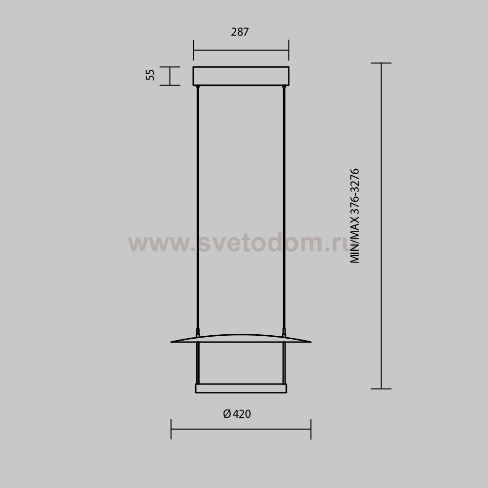 Арматура из алюминия черного цвета, контрастирует белой пластиной диаметром 420мм или 600мм. Силиконовый рассеиватель скрывает LED-источник света с температурой 3000К. В серии представлены светильники двух поколений: в первом источник светит только вверх; во втором источник светит вверх и вниз, что позволяет подсветить рабочую поверхность. Также светильники второго поколения дополнительно имеют функцию диммирования. Высота подвесных светильников регулируется, максимальная длина провода - 3 метра.