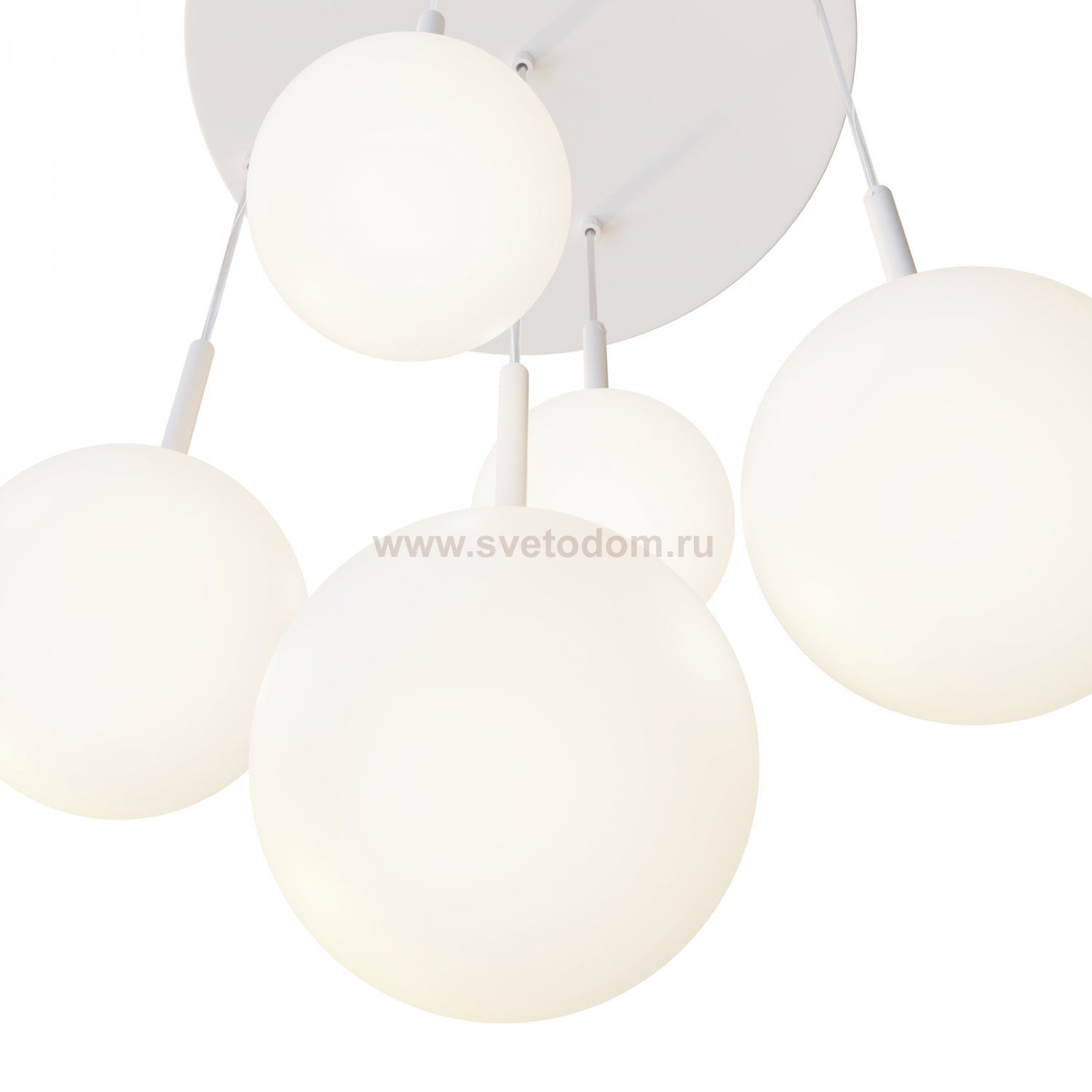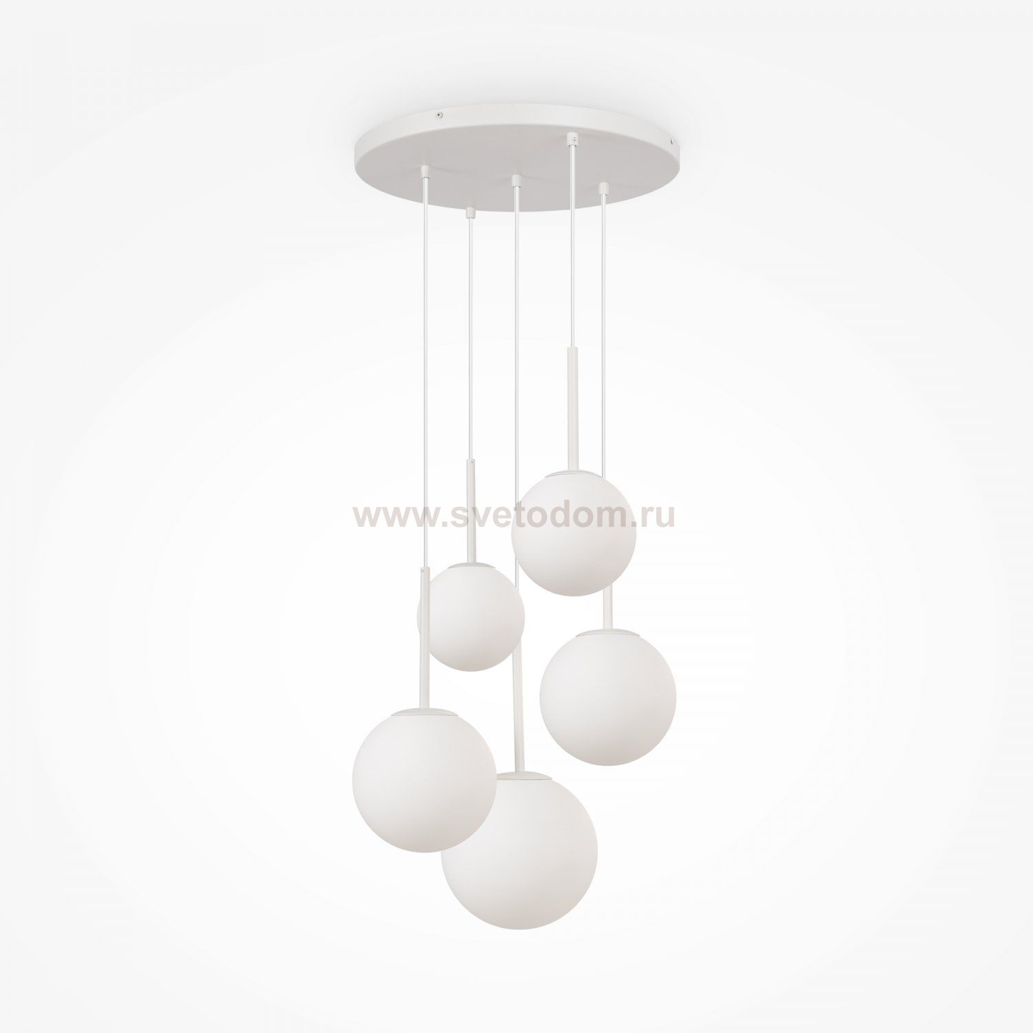 Материал арматуры – металл, цвет - золото, белый, черный. Округлые плафоны из матового белого стекла. Универсальные формы, минималистичный дизайн. Цоколь - E14. Лампы не входят в комплект. Регулируемая высота подвесных светильников.