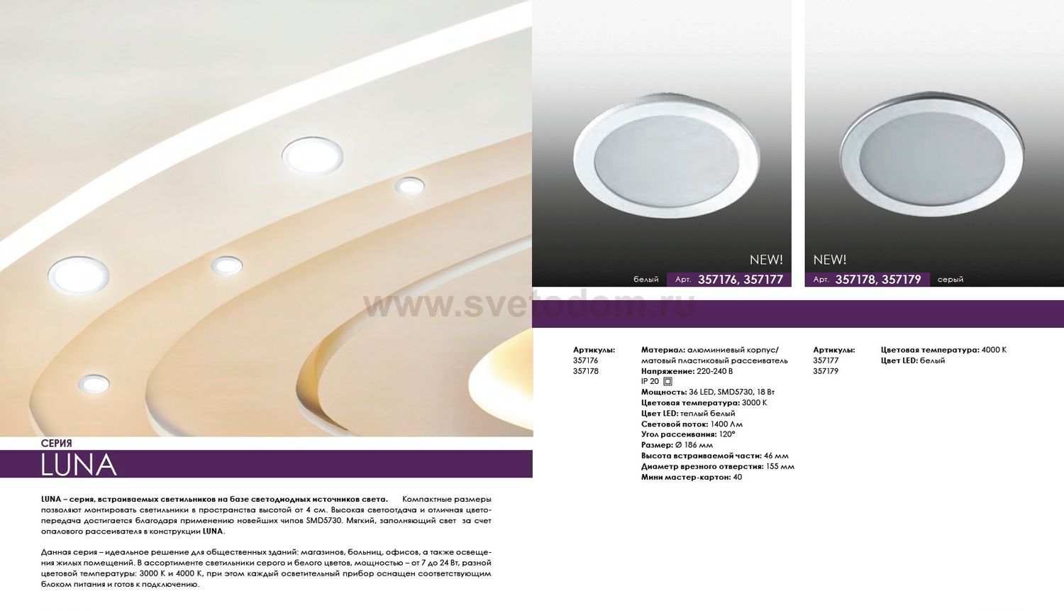 Встраиваемый светодиодный светильник на базе светодиодных источнтков света модели Novotech 357179 из серии LUNA отличается следующим качеством: Корпус светильника произведен из алюминия. Это металл, основными достоинствами которого являются — устойчивость к практически всем видам негативного воздействия окружающей среды, коррозии, небольшой вес, по сравнению с другими видами металла и экологическая безопасность материала. Рассеиватель сделан из матового пластика. Он отличается повышенной стойкостью к механическим повреждениям и защищенностью от факторов внешней среды.