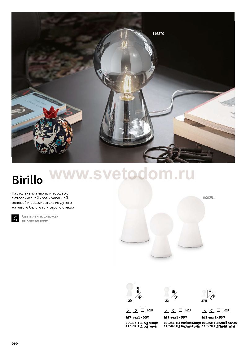 390 Отзывы Ideal Lux BIRILLO TL1 MEDIUM BIANCOПока нет отзывов об этом товаре, напишите и он обязательно появится после модерации! Оставить свой отзывПохожие товары Другие товары магазина Фото
