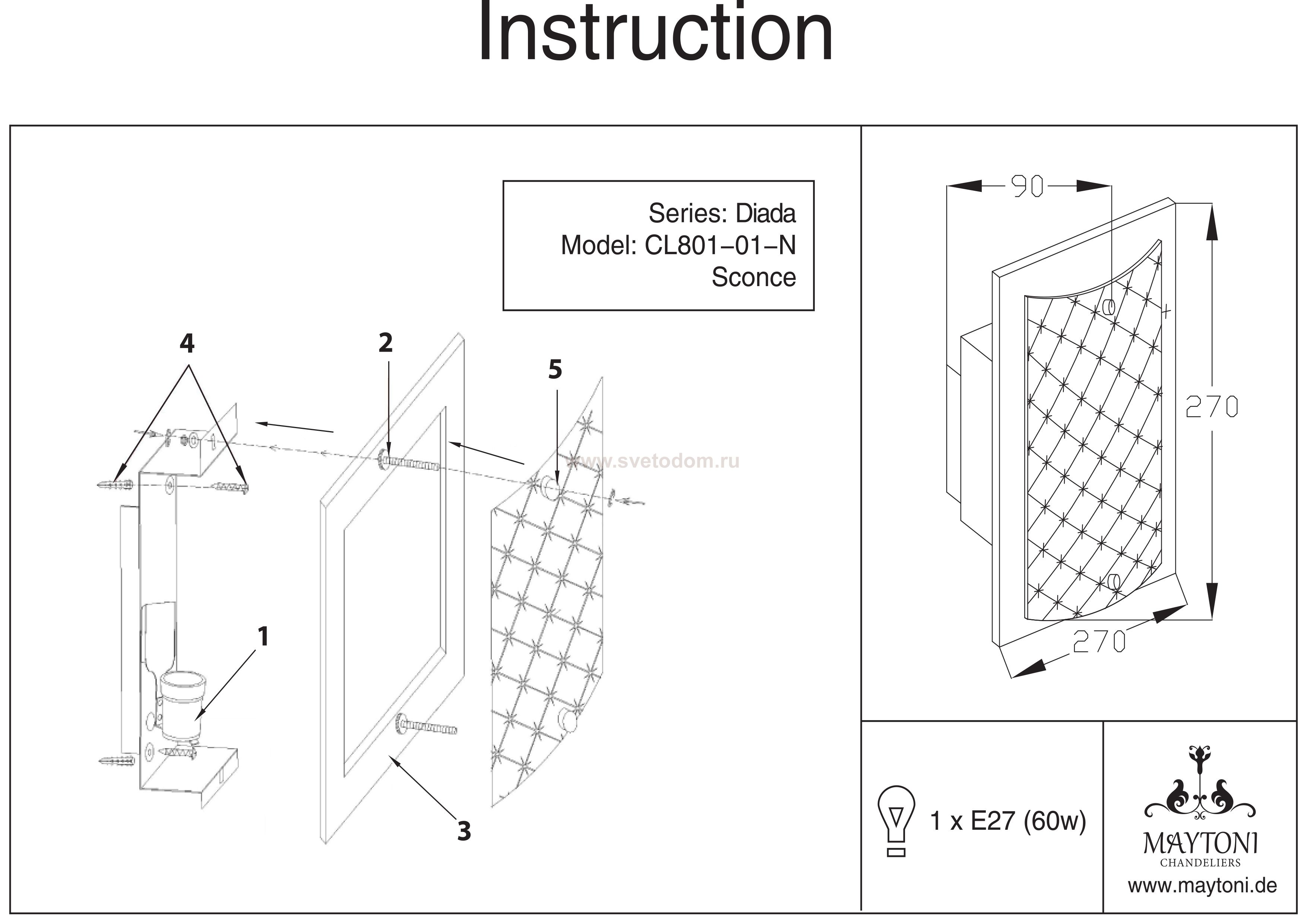 У вас есть загородный дом с высокими потолками, и вы не можете подобрать соответствующую люстру? Тогда взгляните на представленное фото. Настенно потолочная люстра по форме напоминает сплющенную окружность, которая украшена металлическими завитками золотого цвета. В настенно-потолочной люстре Maytoni Geometry C801-CL-01-N инженеры компании Maytoni решили использовать лампы накаливания с цоколем Е14, которые не входят в стоимость товара. Несмотря на небольшую цену, этот осветительный прибор будет радовать вас не только своей безупречной работой, но и своим дизайном, который подчеркнет ваш интерьер. Купить это изделие от немецкой фирмы Майтони вы всегда можете у насНастенно-потолочный светильник. Состоит из зеркала и матового стекла с пескоструйным рисунком. . |