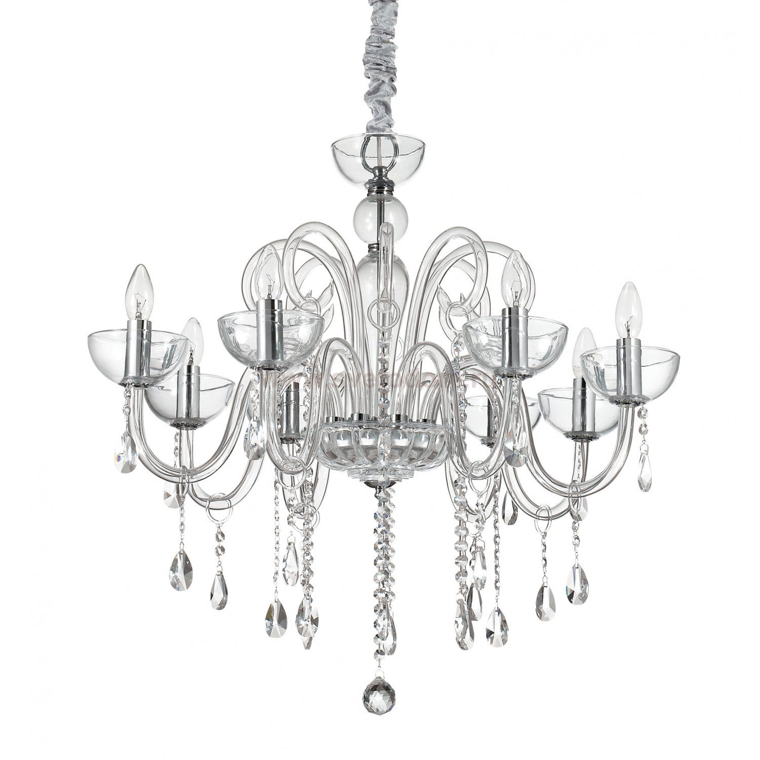 Люстра от известной итальянской фабрики Ideal lux из каталога Classico в классическом стиле под артикулом CANALETTO SP8 TRASPARENTE (27630) серии CANALETTO имеет ряд отличительных характеристик: Люстра из прозрачного дутого стекла ручной работы. Арматура из металла в хроме или золоте. Доступна с прозрачными или янтарными рожками и декоративными лепестками. Подвески из хрусталя с фацетом. Цепь скрыта бархатной тканью.