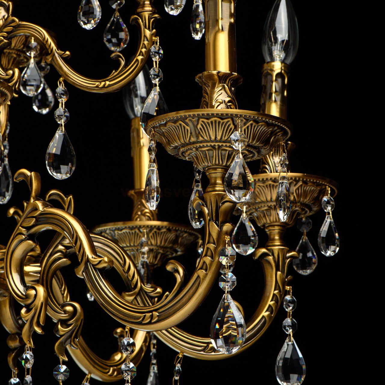 Арматура светильника выполнена из комбинации сплавов металлов и гальванизирована в цвет французского золота. Рожки и центральная часть выполнены по технологии художественного литья. Светильник декорирован подвесками из хрусталя сложной огранки.
