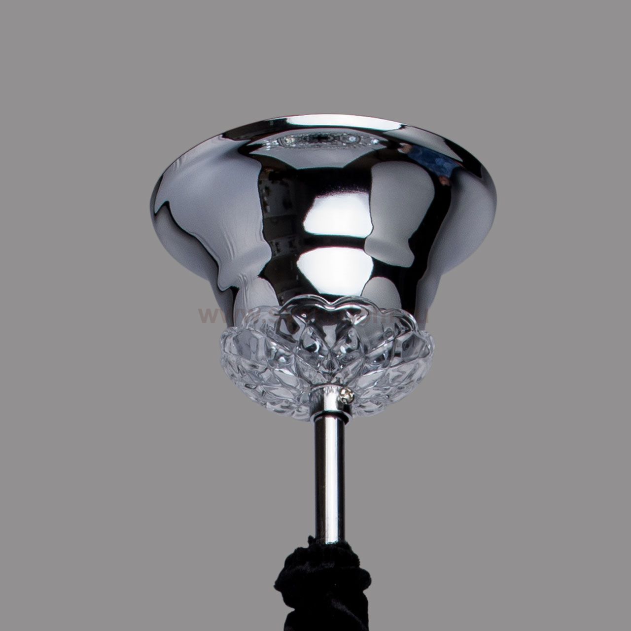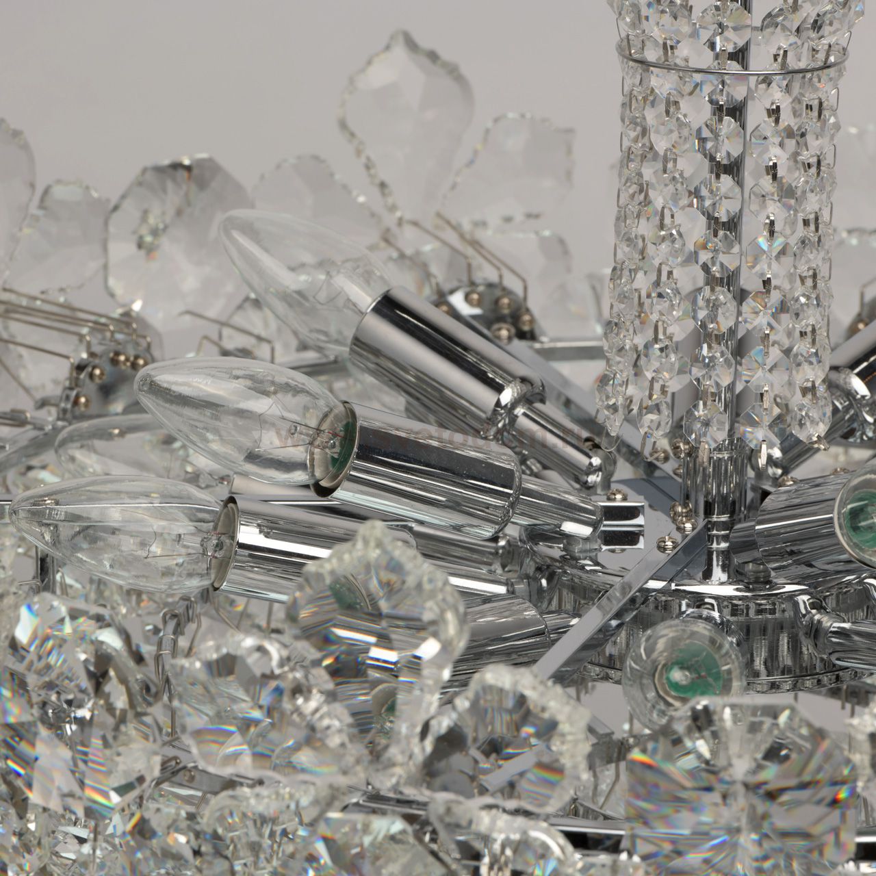 Основание выполнено из металла, гальванизировано в цвет хрома. Потолочная чаша: обработка на токарном станке. Светильник декорирован прозрачным хрусталем высшей категории формы дубовый лист, миндаль, октагон, шар.