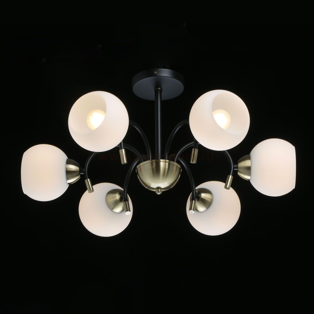 Металлическое основание подвесной люстры окрашено в черный цвет. Отдельные элементы основания гальванизированы в цвет античной бронзы. Светильник декорирован стеклянными плафонами белого цвета. Комментарий