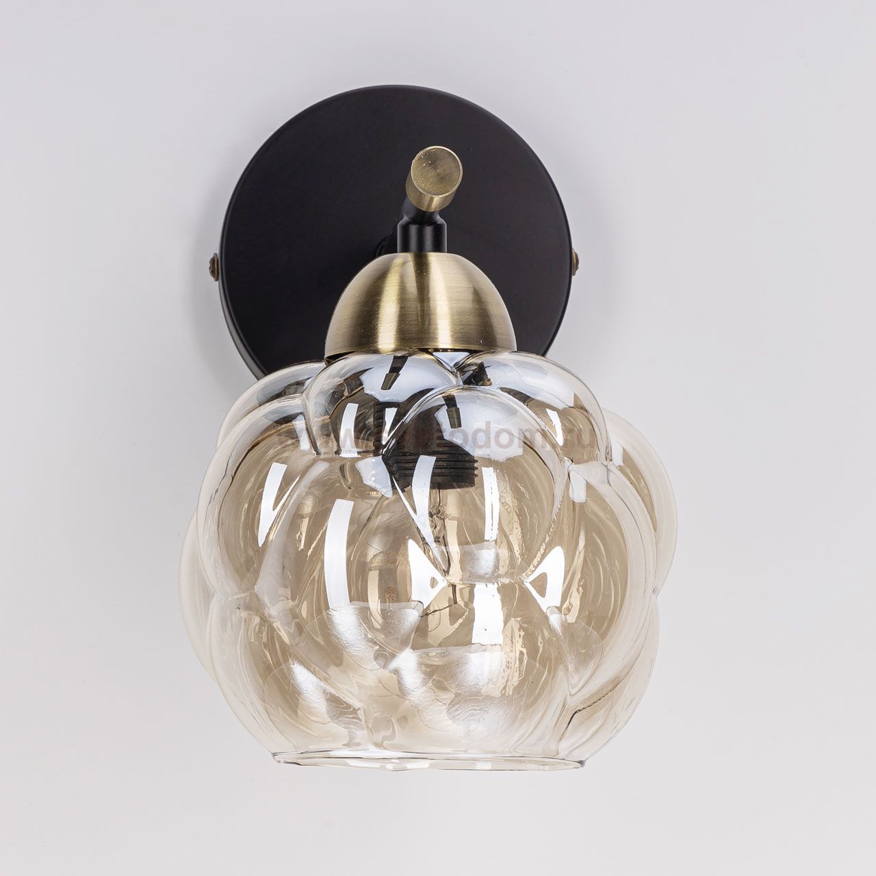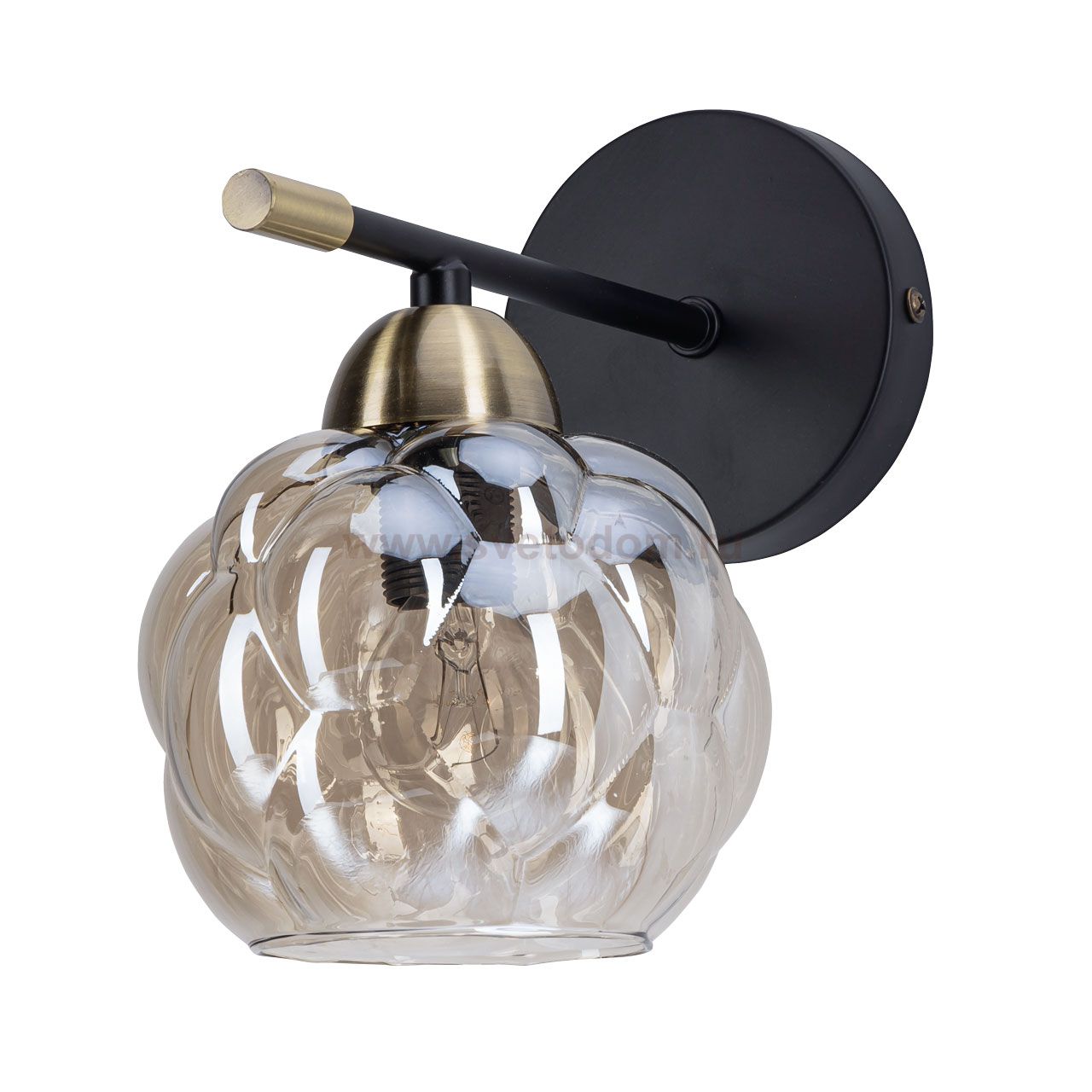 Металлическое основание настенного бра окрашено в черный цвет. Отдельные элементы основания гальванизированы в цвет античной бронзы. Бра декорирована стеклянным плафоном сложной формы, гальванизированным в цвет шампань. Комментарий