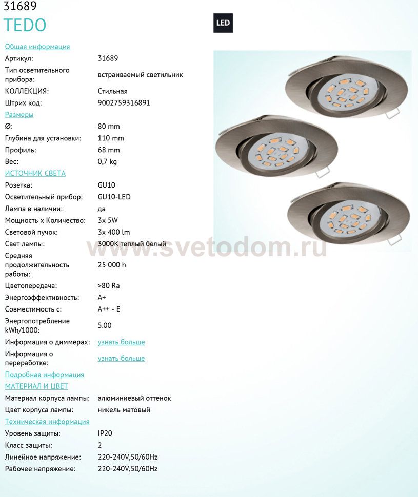 Комплект Светодиодная встраив. светильников TEDO Комментарий
