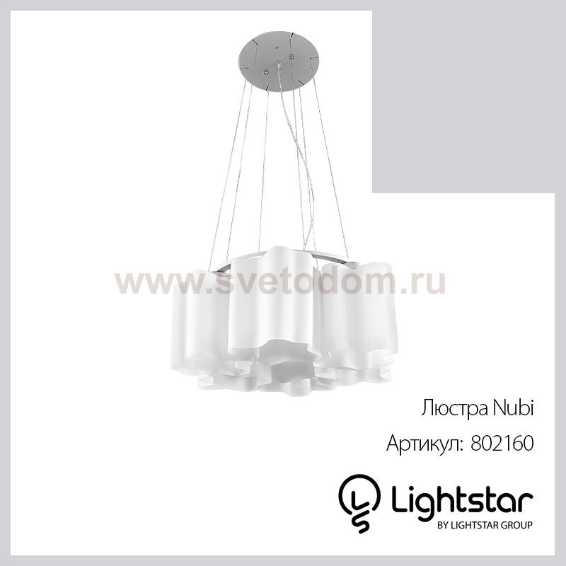 Ассоциация воздушной Nubi с плотными облаками подарила коллекции название. В свете этой люстры интерьер станет уютнее! В стеклянных складках ее высоких плафонов спрятано 6 светодиодных ламп, благодаря чему световой поток направляется вниз, создавая приятное освещение. Матовое стекло слегка приглушает свет, делает его ровным. Стильная люстра Lightstar 802160 станет украшением любого дома. Эта модель от известного производителя не оставит равнодушным ценителей красивых и оригинальных предметов интерьера. Люстра Lightstar 802160 обеспечит равномерное распределение света по всей комнате. При выборе обратите внимание на характеристики, позволяющие приобрести наиболее подходящую модель. Купить понравившуюся люстру по доступной цене Вы можете в интернет-магазине «Светодом».