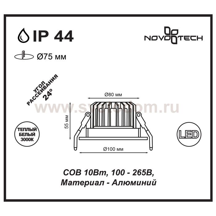 Светодиодный встраиваемый неповоротный светильник с повышенной степенью пылевлагозащиты (IP44) подходит для установки во влажные помещения.
