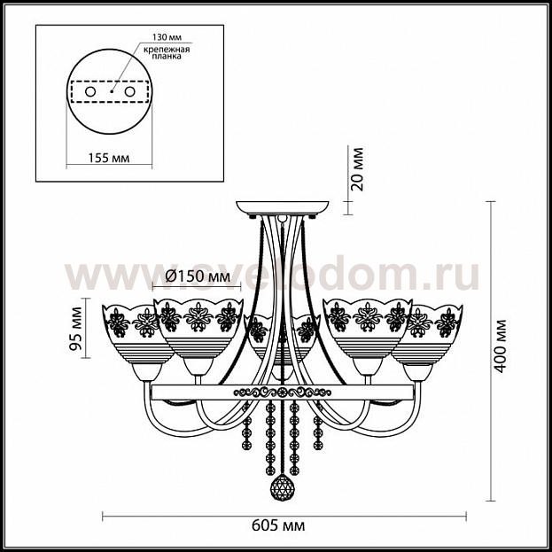 Арматура, декор: металлическая арматура украшена ажурной резьбой, хрустальными подвесками; плафон: тисненое стекло, металл с ажурным рисунком Материал плафона