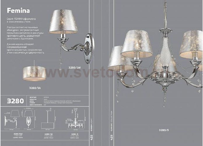 Храктерная особенность артикула 3280/5: Люстра 3280/5 серии FEMINA оформлена в классическом стиле. Люстра состоит из тканевых абажуров с экстравагантным покрытием металлик и арматуры хромового цвета, украшенной цепочками с бусинками. Данная модель обладает непревзойденной оригинальностью, сохраняя при этом классическую сдержанность. Цоколь E14. Мощность 5*40W. Нет ламп в комплекте.